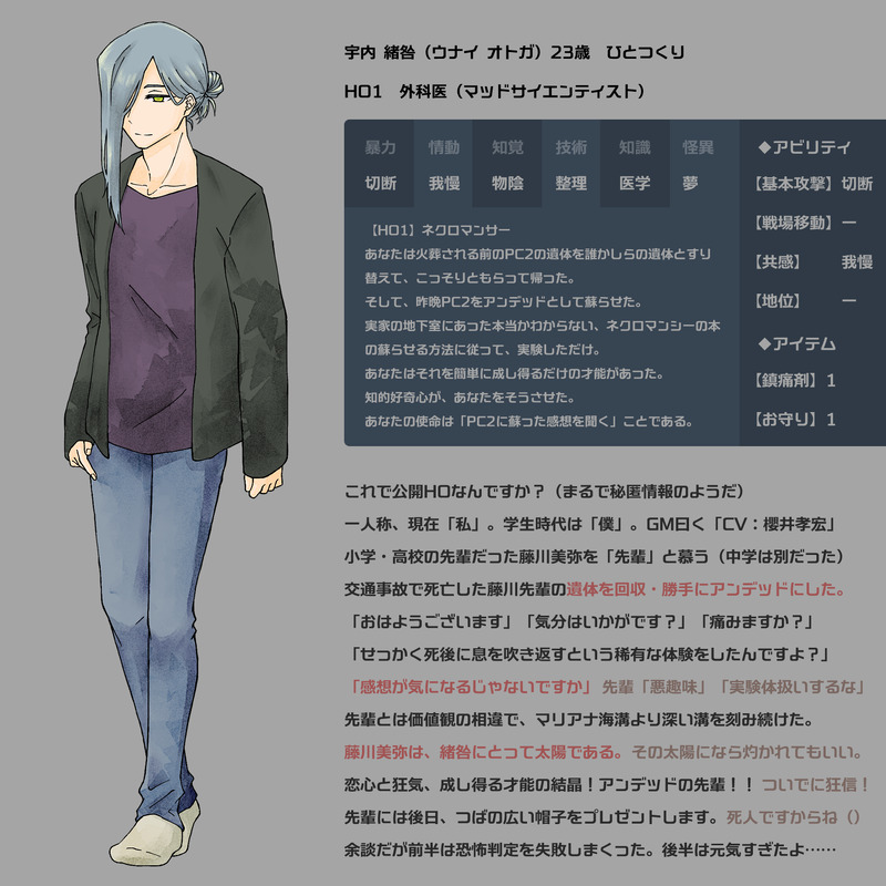 neith_trpg☆quiet followDONE立ち絵まとめ(差分がなかったり他のらくがきがない人たち)【ひとつくり:HO1 宇内 緒咎】【へえ単:HO1 片桐 天落】【上提 明路】【Youtuberヒロト】【松】【迷子:HO4 大阿字 悟】【夜見坂峠の怪:HO2 須戸 有真】 ##卓 show all(+7 images) Tap to full screen (size:1632x1632).Repost is prohibited Let's send reactions! freqpopularsnackothersPayment processing Replies from the creator Follow creator you care about!☆quiet follow neith_trpgDOODLE【暁月6.0】気が狂うと絵を描くようになる現象なんだけどかつて無いレベルでめちゃくちゃめちゃくちゃ恥ずかしいもの描いてる!!!!!!!!!!!!(そもそもCP絵とか基本描かない人なのに夢絵!?!!?!? 2 neith_trpgSPOILER【無色透明の真夏】綾辻くんと杵築くん。正統派すれ違いクソデカ感情(果たしてどこに落ち着くのか) 3 neith_trpgSPOILER【マスダ】一周年……!?嘘!? neith_trpgSPOILER【インモラル・イミテーション】棔 旋理と志乃原先生!!の諸々 6 neith_trpgDONE【イタン】HO2:再訪問者 御縁 灯和(みえにし とわ)特技は心労を重ねることです悲しみと不信と殺意を経て、心が粉々に砕けて死にたくなりました。ただ一人のために生きた結果、憎悪とフレンズになりました!!() 8 neith_trpgSPOILER【救いに非ず】NPC枠 暮林 結乃(くればやし ゆの)2枚目がネタバレ差分。雑貨屋店員。引きこもりな幼馴染の家に通って家庭料理を作る女。 3 recommended works DMmasakiMEMO「心臓がちょっとはやく動くだけ」KPマサキ/ニーア PLなすかつさん/Poodle🐩久々に回しますわよォ!!!!!!!初テキセ!私服のプードルさん可愛すぎて無理 DMmasakiMEMO「瞠目」KP白くま PLマサキ/セレン卓初め!!!ずっと行きたかった瞠目!!!久々のセレンうれし~ DMmasakiMEMO「瞠目」KPマサキ PL藤色/周先生生還!お疲れ様でした!!!先生が非常に優しくてオカンで近所のオバチャンで稀に過激派になるのが楽しかったです!何でもできるイケメンだった…お腹すいたので今から何か食べます DMmasakiMEMO「海も枯れるまで」KP慶さん PLマサキ(HO1塩泡 鯨介)、nasukatuさん(HO2海竜哭 崇)🍆さんと秘匿シナリオに行くのが初めてでめっちゃ警戒してます。枯らしてやる。 2 DMmasakiMEMO「大正浪漫X2U 文豪×現代人」KPうずらさん PL早見さん、マサキ遂に大正X2Uシリーズ最終章だ~~~!!!全てをうずらさん早見さんと通過できて嬉しい!先生の元へ行って参ります♡ DMmasakiMEMO「エイブモズ」KPぱっぴさん PLマサキ、あまさんずっと行きたかったシナリオ!生還しました!!!えのさん優しくてかっこよくてちょっぴりミステリアスで…良い友達が出来た!これは心理学をファンブルするも追い上げを見せたババ抜き!出目良かった…お疲れ様でした~! 3 DMmasakiMEMO「はじめての睡眠姦」KPマサキ PL早見さんサミュテ!もう本当にありがとう。即興部分が多すぎて…?私は幸せな誕生日を過ごせたしテックスも幸せな夜を過ごせました。 ありがとうございました! DMmasakiMEMO「羅生門」KPクスノキさんPLうずらさん、早見さん、マサキ、にきろさん(俺以外が)クソデカ羅生門行ってきます 2 DMmasakiMEMO「アルドラの騎士は君の名を呼ぶ」KPがいPLクスノキ/HO1 たつ/HO2 HO3/マサキ HO4/ごま杉自陣カワイーーーッ!!!全身立ち絵差分2枚あるって本当ですか!??!私は間に合ってないですけど!!!いってきます♪