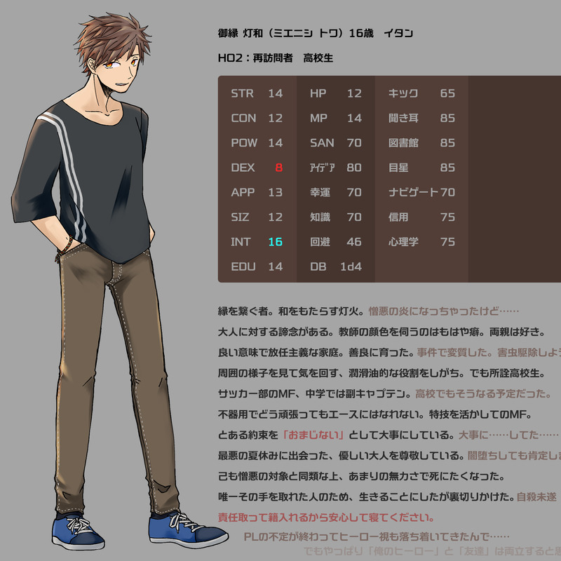neith_trpg☆quiet followDONE【イタン】HO2:再訪問者 御縁 灯和(みえにし とわ)特技は心労を重ねることです悲しみと不信と殺意を経て、心が粉々に砕けて死にたくなりました。ただ一人のために生きた結果、憎悪とフレンズになりました!!() ##卓 show all(+7 images) Tap to full screen (size:1632x1632).Repost is prohibited Let's send reactions! freqpopularsnackothersPayment processing Replies from the creator Follow creator you care about!☆quiet follow neith_trpgDOODLE【暁月6.0】気が狂うと絵を描くようになる現象なんだけどかつて無いレベルでめちゃくちゃめちゃくちゃ恥ずかしいもの描いてる!!!!!!!!!!!!(そもそもCP絵とか基本描かない人なのに夢絵!?!!?!? 2 neith_trpgSPOILER【無色透明の真夏】綾辻くんと杵築くん。正統派すれ違いクソデカ感情(果たしてどこに落ち着くのか) 3 neith_trpgSPOILER【マスダ】一周年……!?嘘!? neith_trpgSPOILER【インモラル・イミテーション】棔 旋理と志乃原先生!!の諸々 6 neith_trpgDONE【イタン】HO2:再訪問者 御縁 灯和(みえにし とわ)特技は心労を重ねることです悲しみと不信と殺意を経て、心が粉々に砕けて死にたくなりました。ただ一人のために生きた結果、憎悪とフレンズになりました!!() 8 neith_trpgSPOILER【救いに非ず】NPC枠 暮林 結乃(くればやし ゆの)2枚目がネタバレ差分。雑貨屋店員。引きこもりな幼馴染の家に通って家庭料理を作る女。 3