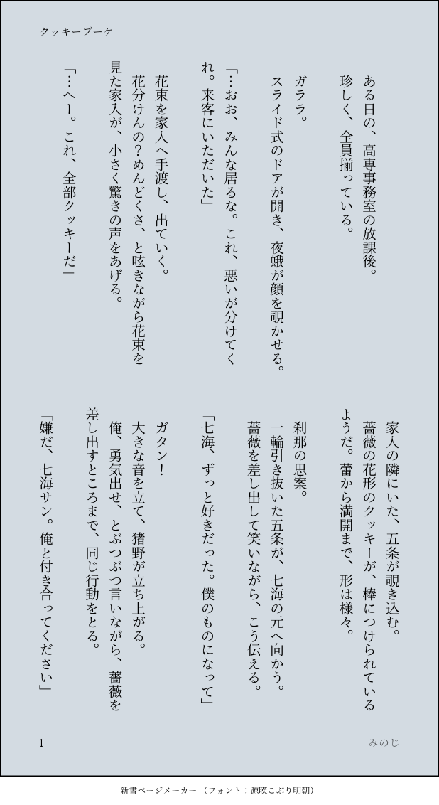 kanashiki79☆quiet followMOURNING七伊版クッキーブーケ show all(+2 images) Tap to full screen (size:618x1132).Repost is prohibited Let's send reactions! freqpopularsnackothersPayment processing Replies from the creator Follow creator you care about!☆quiet follow kanashiki79DONE徒花の温度 続き(R18)18歳未満および高校在学中の方の閲覧禁止です。まぁそこで収まらないよねって…パスワードは、後半で七が寛に教えていた理論を漢字4文字+18歳以上?(Y/N) 1851 kanashiki79DOODLE続いた寛七すけべ絆創膏を口で剥がすひろみすけべんごしって言葉は相互さんが言ってたR18↑? 1818 kanashiki79DONE2025/5/18頒布開始「輪郭をなぞる」(寛七)、5章部分をR18として改稿したものです。PASS:18↑?(yes/no)+彼らが収穫した果物名をカタカナで 9981 kanashiki79DOODLE【呪詛車アンソロジー】錆色パラドクスに寄せた話「視えるもの」の後記です。パスは、該当作品内で呪詛車さんが飲んでいたお酒の名前をカタカナで。 974 kanashiki79TRAININGただただ朝からいちゃついておせっせしている寛七18↑?(y/n)+寛七を4文字半角数字の計7桁で 2072 kanashiki79DONE2025利きひろみ 3