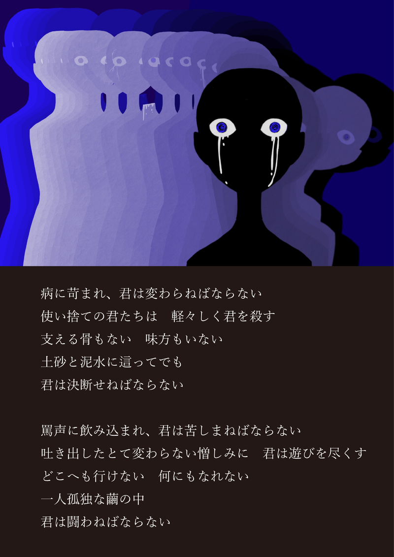 月炬-ツキコ-☆quiet followMOURNING[高校時代]2019年頃制作。詩と絵からなる作品。2019年頃に、遠い昔の、高校時代を思い出しながら描いた。成仏してくれ笑 #オリジナル original #イラスト illustration Tap to full screen (size:2481x3508).Repost is prohibited Let's send reactions! freqpopularsnackothersPayment processing Replies from the creator Follow creator you care about!☆quiet follow 月炬-ツキコ-DOODLE 月炬-ツキコ-DONE誰が手Tagate 月炬-ツキコ-MOURNINGどうすればいい。どうすれば救われる。描くしかない。きっと一生そうするしかない。仕方がない。背負った業がそれなんだ。置き去りの心はもうどこにもない。全て散ったんだ。許せよ。僕だってもうわからなかったんだ。 月炬-ツキコ-DOODLE最果ての自我 月炬-ツキコ-DOODLE描いたきり、忘れていた絵。 月炬-ツキコ-DONEパンドラの棺 related works サブリミナル美MAIKING途中。色塗ると潰れそうだなあ、と不安を抱きーの、髪型が決まらねーの、な絵。 サブリミナル美PROGRESSどんどんイっちゃってる奴になってるけど、描いてて楽しいので仕方ないね(なくないね)ケーキ配達人は、出来上がりを想像して色を置いていく塗り方だったのに対し、こっちは影の上に肌色重ねてる。不健康そうな肌には便利なんだけど、単純にそう言う肌の色が想像できないんだよな…。不健康と色黒の肌色バリエーション作らねば。でも今はちょっとこの塗り方が面倒に感じるのは進歩かも。 サブリミナル美MOURNINGヒヨッてコントラストよわよわ サブリミナル美PROGRESS「穏やかで知性のある奴は丈の長い服を着せて…」と思ったけどその固定概念どこからきたんだろ?露出激しくても特別なんとも思われない文化の世界だってあるかもしれないよなあ…?そういえば。下書き記事のコメント欄に描くことで、途中保存もできるようになったし、何よりスマホを横にするだけですぐ確認ができるようになったので私賢い(賢くない)終盤に気付く愚かさよ…。 サブリミナル美DONE線画だけのときの方が良かったので、完成カテゴリーに入れとこう。 From_六番PASTぽいぽい 🍨🍊DOODLE #創作 #オリジナル ##かふの創作 サブリミナル美TRAINING頭の中で「横向いた睨む鬼を描きたいなあ」とざっくり考えてたので、落書きしてみた。アタリも下書きも無しでボーッとしながら描いたのに、楽しかったし迷いもなかった。意外と「描きたい!」と思ったら何も考えず描けば良いのかも?違うな、頭の中にちゃんとイメージすることが大事?うーんもう分からん。でも、手癖でも昔よりは描けるってことは、自分の引き出しは少しずつでも良くなってるのかな~。 サブリミナル美MAIKINGメイキング?みたいなもの。 3 recommended works LinyuPROGRESSゼリっちかわいいん#フーファン #イラスト #フードファンタジー 美和子MAIKINGパーカーと黒縁メガネ② raruDOODLE新巻が出たので! kritaDONEわたもて ネモ ビックリマンシールとコラボする色鉛筆で4時間かけて描きました。 PriucesshanageDONE【大興奮】ALFEE漫画『超回転すし屋さんに三人で行ってみたら、思いのほか賢さんが興奮していた!!』#alfee #アルフィー #桜井賢 #坂崎幸之助 #高見沢俊彦 #寿司 #かわいい #漫画 #イラスト #マンガ #不憫 #さより地獄 #ラーメン #面白い #新幹線 8 だしまきDONE今日中にできた!メリークリスマス🎅 IrisDOODLEDrawing nibosiDONE笑顔 2 咲@クーピーDONE月夜ちゃん #イラスト #アナログ #筆ペン #オリキャラ