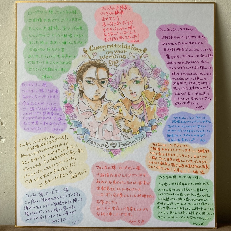 ピクトスクエアにて個人開催しておりますフェンネル×ローズマリーWebオンリーオルフェンズマリッジにて公開の「フェンマリ獄中婚お祝い色紙」お披露目です。waka様発案で開始して企画でしたが、せっかくなのでオンリーに合わせて公開させていただけることになりました♡実際にお会いした方や、めおが代筆させていただいた方など、たくさんのフェンマリ推しの方にご協力いただきました。ありがとうございます!
