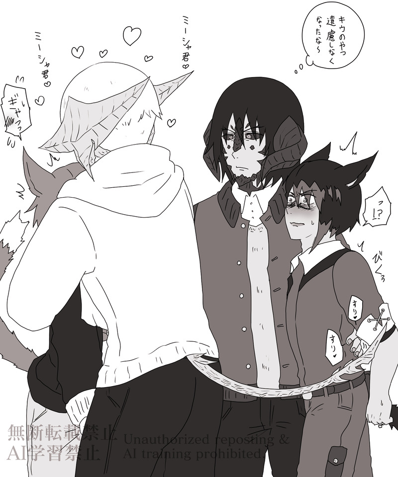 うちの子。うちのアウラ♂×ミコッテ♂カップルたちのイチャイチャ落書き。