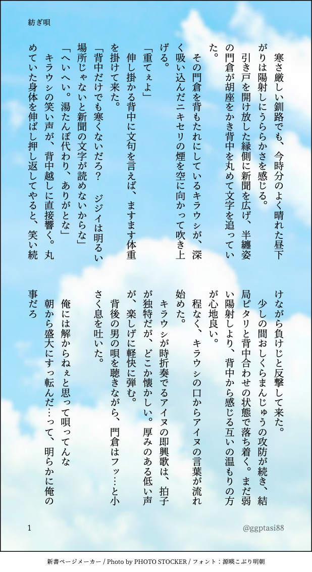 こなつ🦌☆quiet followREHABILI『紡ぎ唄』門キラ1作目 #門キラ show all(+2 images) Tap to full screen (size:618x1132).Repost is prohibited Let's send reactions! freqpopularsnackothersPayment processing Replies from the creator Follow creator you care about!☆quiet follow こなつ🦌DONE門キラ『一つの終わり、その後の始まり』最期まで共に居る2人の話。死の描写があります。自分でも苦手な題材ですが、お盆が近いので…💦旧Twitterでの『存在しない作品』の1つです。 7 こなつ🦌DONEビール工場カドクラスイッチ後、駅舎合流までの門キラ。微エロなのでワンクッション入れてます。 12 こなつ🦌PAST門キラ『四月一日』エイプリルフール小話 4 こなつ🦌PAST門キラ『セピア色の探し人』⚠️にょキラです 7 こなつ🦌PAST門キラ『眠りの猫の願い事』おひるねこが可愛かったので🐱 4 こなつ🦌PAST門キラ短編いろいろ纏め 7 related works 上课睡觉人DOODLE你别再画这种东西了 6 シオ原DOODLE色差分も気に入ってるから見て とみいMOURNING 2 かしおりDONE9/24tnkn3にて無料配布した門キラ本生臭坊✳️主×未亡🦌人パロです!(1ページめの注意書きをご覧くださいませ)お手に取ってくださりありがとうございました〜🥺! 9 _uchida13DONE門キラ原作軸 4 書(格納庫)SPOILERようやく本誌に追いついた記念の絵(最新話というわけでもないですが) 2 mochifuREHABILI現パロ。道内在住、喫茶店店主のキラウシ(37)と居候のカドクラ(49)が、ふたりで赤ん坊の面倒をみる話です。(※門キラです。付き合ってます)北海道の地理がわかりません。方言も雰囲気です。(本文には出てきませんがキラウシくんの父親は他界しており、喫茶店は元は父親の店です) 33 くいっくすたDOODLE今さらながら5月、6月についったに載せた140字や短いものをまとめました。あんまりなかった…。3月、4月の方にも間違って入ってるのがひとつあります。東の祭の話はインテが羨ましくて書いたちょっとお気に入り。ちょうど今も祭の後ですし! 19 _uchida13DONEキャバクラにいるキラウㇱと一緒にいる門の独白(現パロ) 1029 recommended works semimaru2160DOODLE[航空パロ+唐揚げ]ちょっと続く予定なのでポイしときます(絵柄変わってて死にそうですが) 2 小嶋家DOODLE相※撲※しようぜ!門キラ 2 こなつ🦌REHABILI #14字でキスシーンを書く門キラ 4 momoringoesTRAINING【門キラ】140字お題SSまとめ10枚 10 kkkatkoyMOURNING11/22に書き始めて書き上がらなかったものです。結婚できる世界です。 13 momoringoesTRAINING門キラ140字SS 2つのお題10個まとめましたちょっとえっちもあるヨ あと現パロもしれっとあるヨ 10 fujihaya00117DONEハピバキラウシくん!!!スーパー遅ればせながらキラ誕門キラマンガR18です!1コマ目からセンシティブで申し訳ない!そして合体してなくて申し訳ない!門がナチュラルスケベで申し訳ない!!!(←この辺は追加で何か描きたいいずれ~~)スピード重視のため仕上げがアレですがよろぴくお願いします。 3 kkkatkoyMOURNINGツイッターにあげたもの。現パロ門キラ出会い編です。長くて申し訳無いです。認知行動療法をきら相手にやる門みたいな話になってしまって、もぉ〜ってなってます…。 26 kkkatkoyMOURNINGツイッターにあげたもの。出会いの門視点。門はこのことを3年くらい黙ってます。本人的に結構頑張ってかっこつけたので! 5