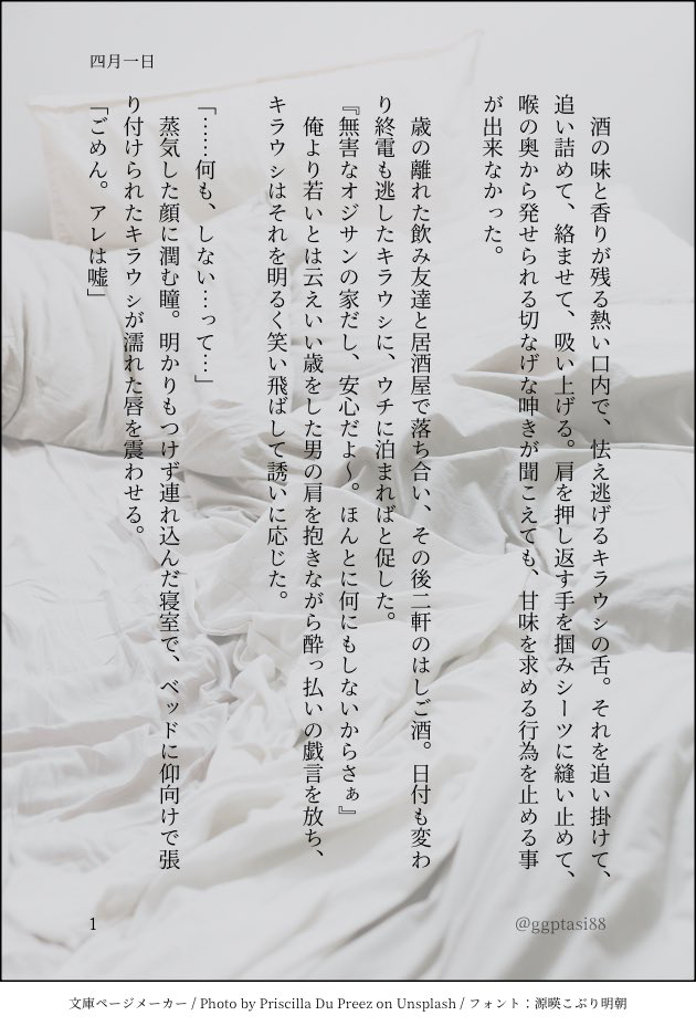 こなつ🦌☆quiet followPAST門キラ『四月一日』エイプリルフール小話 #門キラ show all(+3 images) Tap to full screen (size:630x928).Repost is prohibited Let's send reactions! freqpopularsnackothersPayment processing Replies from the creator Follow creator you care about!☆quiet follow こなつ🦌DONE門キラ『一つの終わり、その後の始まり』最期まで共に居る2人の話。死の描写があります。自分でも苦手な題材ですが、お盆が近いので…💦旧Twitterでの『存在しない作品』の1つです。 7 こなつ🦌DONEビール工場カドクラスイッチ後、駅舎合流までの門キラ。微エロなのでワンクッション入れてます。 12 こなつ🦌PAST門キラ『四月一日』エイプリルフール小話 4 こなつ🦌PAST門キラ『セピア色の探し人』⚠️にょキラです 7 こなつ🦌PAST門キラ『眠りの猫の願い事』おひるねこが可愛かったので🐱 4 こなつ🦌PAST門キラ短編いろいろ纏め 7 related works くいっくすたDOODLE今さらながら5月、6月についったに載せた140字や短いものをまとめました。あんまりなかった…。3月、4月の方にも間違って入ってるのがひとつあります。東の祭の話はインテが羨ましくて書いたちょっとお気に入り。ちょうど今も祭の後ですし! 19 mochifuREHABILI現パロ。道内在住、喫茶店店主のキラウシ(37)と居候のカドクラ(49)が、ふたりで赤ん坊の面倒をみる話です。(※門キラです。付き合ってます)北海道の地理がわかりません。方言も雰囲気です。(本文には出てきませんがキラウシくんの父親は他界しており、喫茶店は元は父親の店です) 33 上课睡觉人DOODLE你别再画这种东西了 6 書(格納庫)SPOILERようやく本誌に追いついた記念の絵(最新話というわけでもないですが) 2 _uchida13DONEキャバクラにいるキラウㇱと一緒にいる門の独白(現パロ) 1029 _uchida13DONE門キラ原作軸 4 かしおりDONE9/24tnkn3にて無料配布した門キラ本生臭坊✳️主×未亡🦌人パロです!(1ページめの注意書きをご覧くださいませ)お手に取ってくださりありがとうございました〜🥺! 9 とみいMOURNING 2 シオ原DOODLE色差分も気に入ってるから見て recommended works semimaru2160DONE蛇足 3 小嶋家DONEお題ガチャより。ぽいぴく行き昼間はよく門倉がキラウシに甘えているが、夜は大体キラウシが門倉に甘えている。 https://odaibako.net/gacha/3888?share=tw mochifuREHABILI現パロ門キラ(カドクラ→水道会社社員、キラウシ→工芸作家兼便利屋さん)のお話です。読み切りなのでこのお話単体でも読めます。キラウシがもらった酒粕を料理したり、食べたり、酔っぱらったりするだけのお話です。(文化風習にわかなので間違っていたらすみません…ふわっと読んでください)オチウ(描写は)ありません。ちゅーだけしてます。(全年齢です) 10 mochifuREHABILI現パロ。道内在住、喫茶店店主のキラウシ(37)と居候のカドクラ(49)が、ふたりで赤ん坊の面倒をみる話です。(※門キラです。付き合ってます)北海道の地理がわかりません。方言も雰囲気です。(本文には出てきませんがキラウシくんの父親は他界しており、喫茶店は元は父親の店です) 33 小嶋家DONE門にもらったやつだとなお良し あかなぎMOURNINGどっちにしようか迷って没にした方の供養(っ’-‘)╮=͟͟͞͞赤面させると🦌✳️感が増す 2 小嶋家DONE心配される事もある 3737_gkDOODLE門倉とキラウシの夜18歳以上ですか?(yes/no) 3 kkkatkoyMOURNING同棲一ヶ月目の門キラがクリスマスの話をする話。 7