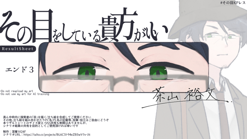 bunTRPG☆quiet followINFO『その目をしている貴方がいい』 KPレスシナリオPL:ぶんゆ / 茶山 裕文___エンド3 Tap to full screen (size:900x506).Repost is prohibited Let's send reactions! freqpopularsnackothersPayment processing Replies from the creator Follow creator you care about!☆quiet follow bunTRPGINFO『HO1とHO2が箱に詰められるだけ』KP / ぶんゆHO1:辰巳森 瑛太 / ヨネHO2:セレスティア / ちぇけら_______シナリオエンド来てくれてありがとう📦 bunTRPGINFO『よるのとばりのうちがわで』 PL:ぶんゆ / 羊々(VOID HO4継続)___エンド-2「、だから、羊々は_________」 bunTRPGSPOILERVOID 現行未通過×TODAY 2 bunTRPGINFO『夜は寛容』 PL:ぶんゆ / 羊々(VOID HO4継続)___シナリオクリア 生還「アンドロイドに睡眠は正直不要」「けど、ちる、はほしい」 bunTRPGINFO『ちいばくっ!!』🌾辰巳森 瑛太🐔セレスティア✋蛇街 茂泓🦈羊々______各1成功、1爆発「「「「もう知育菓子はこりごりだ~!」」」」 bunTRPGINFO『空白の航海』 PL:ぶんゆ / 羊々(VOID HO4継続)___シナリオクリア 生還「だから、ありがとう。またね」2枚目以降、ネタバレなし出目芸人の様子です 6 recommended works shomin_azrsSPOILERオルシン 現行・未通過❌↓これはふせったー○○○○○○○○○○○○○○○○○○○○○○○○○○○○○○○○○○○○○○ってやつ🥳https://fse.tw/jH5AUg1z#allpass通過済み→yes .*・゚銀華.゚・*.INFO卓報告です。CoC【イースの偉大なる図書館へようこそ】KP:銀華PL:ミナリアさん/岸江 彼方生還平和なシナリオを回してきました!!いっぱいRPしてくれるから本当にやってて楽しいんだよな〜!!!ギャグ?シでもいっぱいおしゃべりしてくれてありがとう〜!!次も頑張ろ〜ね♡ 三辺紗那INFOCoCシナリオ「思い立って5分で回せるデートシナリオ クリスマス編」KP/KPC:九曜さん/唐立 鬼灯PL/PC:三辺 紗那/八手 焔珠 丹黃さん/夏祈 燈華 ルトキさん/名雪 冬雅クリスマスのダブルデートしてきましたわよ!!!二組のカップルに進展はありました!もう一枚は今日の語録です 2 ふちの(fuchino)DONEチャスクイ chasca chuychuあったかくしてイチャイチャしなさい ヤニカス/スイガラDOODLER18とさつ回避まつ︎︎ ♀のその後落書き(こてまつ) 2 mugcuploveDOODLEL月하루의 시간🔞🔞🔞붙어먹는거보고싶었어요많이많이숭합니다⚠️🔑:20⬆️?(yes/no) 20 qxjwrtsDOODLEกินกวางกันเถอะคับ(yes or no) mizunoDOODLEうしおがオカルンの境遇を知ったら自分のことのように大泣きするのかなあ komaki_etcDOODLE雨想。スタバのカスタム 1757