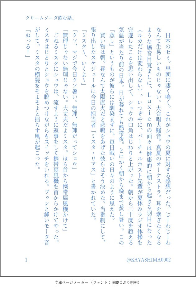 KAYASHIMA☆quiet followDONE🧡+💜。クリームソーダ作る話。日本にロングステイ中のラ面。 #Myshu show all(+13 images) Tap to full screen (size:630x928).Repost is prohibited Let's send reactions! freqpopularsnackothersPayment processing Replies from the creator Follow creator you care about!☆quiet follow KAYASHIMADONE2025.6.29 にじそうさく10にて配布しましたぺーバーです。にじGTA軸if DROPS3人の話足を運んでくださったみなさま、ありがとうございました! 3260 KAYASHIMADOODLE⚠死ネタです。⚠救いはありません。⚠悲恋。モブ♀←💛←💜💛という、全てを尽くしてでも手に入れたいものは手にするんだろうというマフィアとしてのカリスマ性と犠牲について。その後、彼は血も涙も見せない非道の王(ボス)となるでしょう。 2840 KAYASHIMADONE💛💜。⚠不穏・DV表現・共依存風味⚠首絞めあり⚠ふたりはしあわせ(メリバ風味)なんでも許せる方向け 2063 KAYASHIMADONE2024.7.7にじそうさく09にで配ってましたペーパーの小話です。謎軸のなつのおはなし。前日に夕飯を食べ、ホテルに戻り❤️の3Dお披露目を流しながら書きました。ネタは2023.9にわたしが吐いていたもの。 2699 KAYASHIMADONEIsアンソロに寄稿しましたお話です〜。第2弾もまたあるぞ!楽しみだ〜。 4516 KAYASHIMADONE⚠️注意・必読名前のあるモブが登場人物します。マフィア×呪術師同期ルームシェア軸≠配信者呪術・過去についてご都合捏造あります。呪物を祓うシーンに少し強めの表現力が含まれます。苦手な方はご遠慮下さい。2023.5.5にじそうさく07にて頒布させて頂きました作品です。お手にとってくださった皆様、ありがとうございました。再販予定はありません。 41826 related works magDOODLE・だいたい🧡💜の💜右・SSともいえないネタたち・Lシェアハウス設定多め 6522 @Chi2434DOODLE「僕だって抱きたいって思う時位あるよ」から始まるmysh。弱🔞※myが少し意地が悪い。※リバではないですが、shがmyを抱こうと頑張ってるので少しだけ注意。やっと完成しました……ㅠㅠㅠㅠ前の所からそんなに長くないですが本番前辺りまではやってるので注意。pass→例の3文字+わたしの注意書きに記載した3文字 計6文字 5445 夜夜厭病TRAINING*我流ABO梗*我流🦊🐧*DK*左右有意義*對名字是咪在用的香水*骨科*OOC?*多成員客串*⚠️本篇含大量受虐場景,請自己避雷⚠️本篇是12下!!!!!!對你沒看錯我沒說錯!這是下!!!!!!!!!「佔有慾強大的兄控x保護欲旺盛的弟控」互相過招的一點小故事。(同時也是一個白癡在寫一腦洞的時候並不知道自己會寫到12的事故) 11203 夜夜厭病TRAINING*我流ABO梗 *我流🦊🐧 *DK *左右有意义 *對名字是咪在用的香水 *骨科 *OOC? *多成員客串 * “佔有慾强大的兄控x保护欲旺盛的弟控”互相过招的一点小故事。 (同时也是一个傻*在写一脑洞的时候并不知道自己会写到13的事故) 11161 charocharo_oDONE🧡💜 幼なじみ雨って不思議な力があるよね。気温が低い分、熱を求めてしまうのかも。君の隣に居ると我慢ならない程に。─身分違いの幼なじみが両片想いに終止符を打つお話(全14ページ) 14 ohanaMEMO🧡💜デビュー記念常設ボイスの🧡シークレットAと💜シークレットBが繋がってるじゃん!?っていう幻覚。自我めっちゃある。文ではなく私の語り。パスワードは、ボイスファイルの情報のとこに書いてある🧡シクレAの秒数二桁と💜シクレB(EN)の秒数二桁、全部で数字4つ 1438 ohanaDONE🧡💜ハピエンにならなかった 5895 留まる鉛筆MOURNINGドスケベの天才相互様のシチュを借りました👏誤字脱字沢山ございますご了承ください😭18⤴︎︎︎? 1121 姉@Z5ntRDONE【当SSはべったーに移行済みです】https://privatter.net/p/10699453🔞🧡💜ヘルスで働く💜とお客の🧡の話※両方♡喘ぎ※攻のフェラと攻がイラマされてる▼続篇です完結編の本▲https://booth.pm/ja/items/5166882 21 recommended works KAYASHIMADONE💛💜クールなの!キュートなの!学パロ。他校生同士のファーストコンタクト。 6 fumi乃DONE💛💜🍨💡2022/9/30画像差し替えました shu_kun_sukiDONE💙💜 缶ビール一本で酔うpass→💜の口癖三文字(小文字) 2838 nasi_eyyyDOODLECP有#lucashu #shuca 2 1234321_vPAST💙💜Twitterのまとめです💜が💙に「呪い」をかける話 4 SORADOODLE #Lucashu・大學遠距離戀愛 3329 CandleCollusMOURNINGG18 뫼르그렉 bonnou85DOODLE🔞🧡💜︎︎ ♀の話。💜︎︎ ♀ちゃんが卒i業i式の日に、🧡に抱かれに行く話。18⤴︎y/n? 5986 Edwina 妖玦DOODLE #mafiyami #lucashu√ OOC有√ 同居設定√ 青梅竹馬不同系大學生設定√ 沒有後續 568