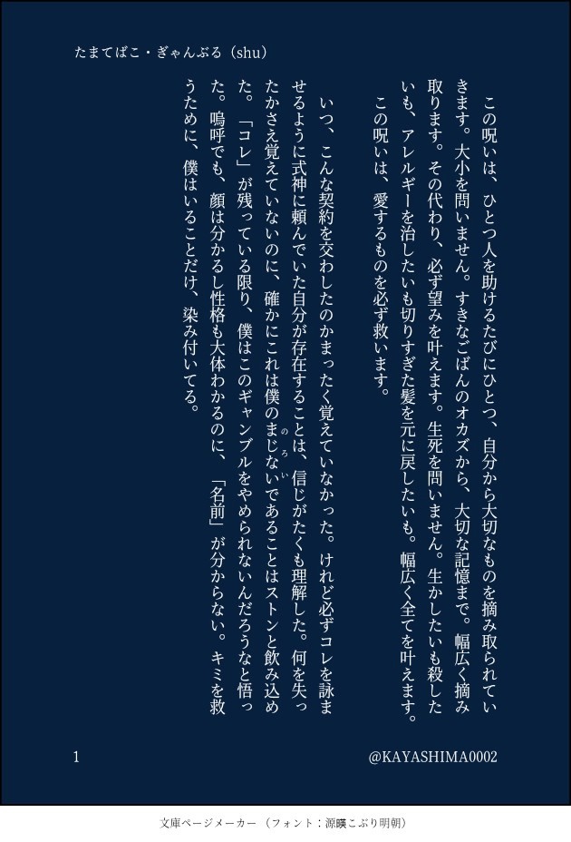 KAYASHIMA☆quiet followDONE💜。たまてばこ・ぎゃんぶる。 ##続かないお話の木 Tap to full screen (size:630x928).Repost is prohibited Let's send reactions! freqpopularsnackothersPayment processing Replies from the creator Follow creator you care about!☆quiet follow KAYASHIMADONE2025.6.29 にじそうさく10にて配布しましたぺーバーです。にじGTA軸if DROPS3人の話足を運んでくださったみなさま、ありがとうございました! 3260 KAYASHIMADOODLE⚠死ネタです。⚠救いはありません。⚠悲恋。モブ♀←💛←💜💛という、全てを尽くしてでも手に入れたいものは手にするんだろうというマフィアとしてのカリスマ性と犠牲について。その後、彼は血も涙も見せない非道の王(ボス)となるでしょう。 2840 KAYASHIMADONE💛💜。⚠不穏・DV表現・共依存風味⚠首絞めあり⚠ふたりはしあわせ(メリバ風味)なんでも許せる方向け 2063 KAYASHIMADONE2024.7.7にじそうさく09にで配ってましたペーパーの小話です。謎軸のなつのおはなし。前日に夕飯を食べ、ホテルに戻り❤️の3Dお披露目を流しながら書きました。ネタは2023.9にわたしが吐いていたもの。 2699 KAYASHIMADONEIsアンソロに寄稿しましたお話です〜。第2弾もまたあるぞ!楽しみだ〜。 4516 KAYASHIMADONE⚠️注意・必読名前のあるモブが登場人物します。マフィア×呪術師同期ルームシェア軸≠配信者呪術・過去についてご都合捏造あります。呪物を祓うシーンに少し強めの表現力が含まれます。苦手な方はご遠慮下さい。2023.5.5にじそうさく07にて頒布させて頂きました作品です。お手にとってくださった皆様、ありがとうございました。再販予定はありません。 41826