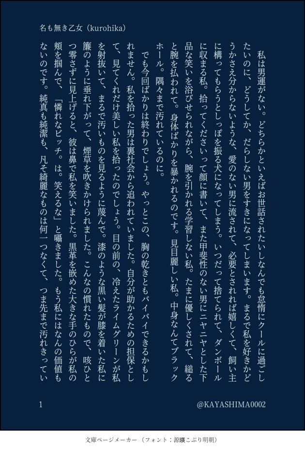 KAYASHIMA☆quiet followDONE🖤💚♀。名も無き乙女。 ##続かないお話の木 show all(+1 images) Tap to full screen (size:630x928).Repost is prohibited Let's send reactions! freqpopularsnackothersPayment processing Replies from the creator Follow creator you care about!☆quiet follow KAYASHIMADONE2025.6.29 にじそうさく10にて配布しましたぺーバーです。にじGTA軸if DROPS3人の話足を運んでくださったみなさま、ありがとうございました! 3260 KAYASHIMADOODLE⚠死ネタです。⚠救いはありません。⚠悲恋。モブ♀←💛←💜💛という、全てを尽くしてでも手に入れたいものは手にするんだろうというマフィアとしてのカリスマ性と犠牲について。その後、彼は血も涙も見せない非道の王(ボス)となるでしょう。 2840 KAYASHIMADONE💛💜。⚠不穏・DV表現・共依存風味⚠首絞めあり⚠ふたりはしあわせ(メリバ風味)なんでも許せる方向け 2063 KAYASHIMADONE2024.7.7にじそうさく09にで配ってましたペーパーの小話です。謎軸のなつのおはなし。前日に夕飯を食べ、ホテルに戻り❤️の3Dお披露目を流しながら書きました。ネタは2023.9にわたしが吐いていたもの。 2699 KAYASHIMADONEIsアンソロに寄稿しましたお話です〜。第2弾もまたあるぞ!楽しみだ〜。 4516 KAYASHIMADONE⚠️注意・必読名前のあるモブが登場人物します。マフィア×呪術師同期ルームシェア軸≠配信者呪術・過去についてご都合捏造あります。呪物を祓うシーンに少し強めの表現力が含まれます。苦手な方はご遠慮下さい。2023.5.5にじそうさく07にて頒布させて頂きました作品です。お手にとってくださった皆様、ありがとうございました。再販予定はありません。 41826