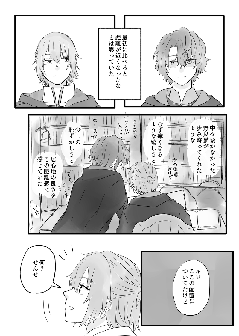 sujikonigiri_11☆quiet followDONE『擽ったい距離』12頁2023.03.26開催 ファウネロwebオンリー「不器用なぬくもりを紡いで4」の展示作品でした。素敵なイベントをありがとうございました! #ファウネロ faunello show all(+11 images) Tap to full screen (size:3638x5102).Repost is prohibited Let's send reactions! freqpopularsnackothersPayment processing Replies from the creator Follow creator you care about!☆quiet follow sujikonigiri_11PAST「ネロのア・ラ・カルト」アンソロジーに寄稿させて頂いた漫画のWEB再録です。発行から1周年、おめでとうございました! 12 sujikonigiri_11MAIKING『惚気話を聞かせて』ファウネロWebオンリー「不器用なぬくもりを紡いで」5の展示漫画でした!素敵なイベントをありがとうございました!【ご注意!】女の子賢者さん(真木晶)が沢山出て、沢山喋ってます。苦手な方はご注意下さい。また最後の話だけ、下書き状態になってます。すみません。 26 sujikonigiri_11DONE『擽ったい距離』12頁2023.03.26開催 ファウネロwebオンリー「不器用なぬくもりを紡いで4」の展示作品でした。素敵なイベントをありがとうございました! 12 sujikonigiri_11PAST「彩縁奇縁」2018年発行別ジャンルで申し訳ないのですが、先日のライブで遂に担当のお当番回が巡ってきまして!気が昂り過ぎて、過去の作品を挙げるという暴挙に出ました。トーンすら貼れてないという惨状ですが、個人的には気に入ってるお話です。見ている方は居ないと思いますが、当時手にとって下さった方々、本当にありがとうございました! 20 sujikonigiri_11DONE第二回『隣にいてもいなくても』の展示漫画でした。ファウストとネロが日記を通してなんやかんやする話です。恋愛のような親愛のような関係 24 related works azurem00nDONE東ドロライのお題「悪いこと」をファウネロでお借りしました。ネを泣かせたいファの話。前に上げた話↓と軸は繋がってますけど単品でもいけます。https://poipiku.com/715549/5119178.html 3 tsu_brnrDONE年齢差逆転あり、なんでも許せる方向けの現パロ。受けが可哀想なところを攻めが救う話が好きなので、そういう感じです。後日pixivに掲載+続きを連載形式で公開予定。設定ファウスト(21)大学4年生。大学院進学が決まっていて、現在は卒論準備に日々身を削っている。アルバイトとしてヒースとシノの家庭教師をしている。ネロ(6)訳ありっぽい雰囲気の子ども。深夜のコンビニの前でファウストと出会う。 4518 azurem00nREHABILI【ファウネロ】年下のおとこ、かわいいなぁってなってるファネ 959 azurem00nREHABILI【ファウネロ】最近の供給にどうしたらいいかわからなくなったのでいちゃつかせたかっただけのファウネロ 1054 OotukinousaDONE母乳出ちゃうネロ。ファ家同棲。やまなしおちなしいみなし 5029 azurem00nDONE「不器用なぬくもりを紡いで」3展示フォ学のファネ未満がのんびりごはんしてるだけ 2498 OotukinousaDONE多分付き合ってるネファネ 1716 azurem00nTRAINING【ファウネロ】眠るまでは猫の日勢いで書いたグルーミングしてるファネうちの先生はネをでっかいにゃんこだと思ってる節がある 1441 azurem00nDONEファウネロSSお題:砂糖菓子 2 recommended works なみちDONE「「「おいで」」」ポーズはさどらい幕張2日目キャラ人選はガチャより なみちDONEかのん ほしざわPASTふゅみ 2 ゆめちゃんTRAINING練習 oboro10DONE差分で帽子なし別加工のムル きいろDOODLEわんこレノちゃん yuki_seiyaDONE想楽くんお誕生日2020 yashimaDOODLEまほやくログ置き場 23 chomoimoiPROGRESSブラネロ合同誌に追加させてもらうやつ。〆切までに終わりそうになかったら自分で発行する方に収録するんだ… 3