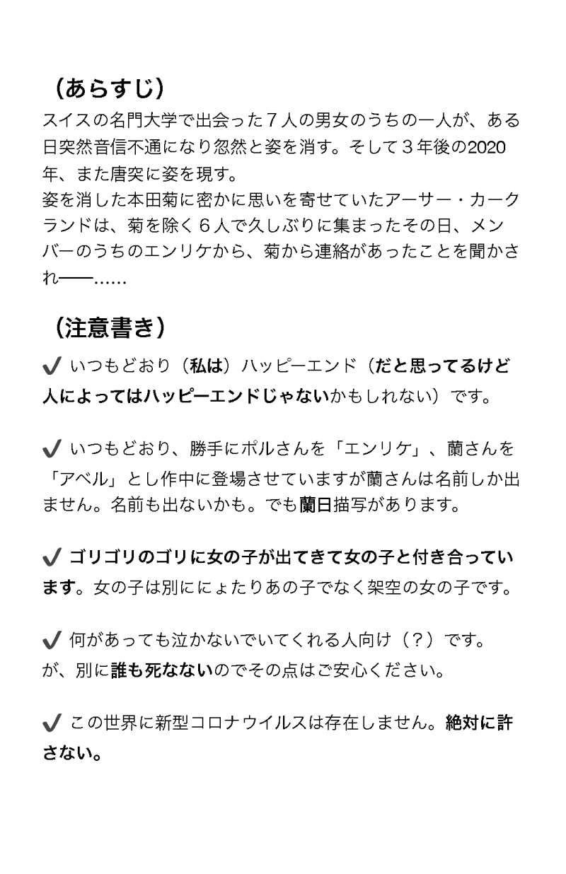m_tekk☆quiet followREHABILINIGHT SODA #0.5 注意書き #朝菊 #注意書き show all(+2 images) Tap to full screen (size:1100x1700).Repost is prohibited Let's send reactions! freqpopularsnackothersPayment processing Replies from the creator Follow creator you care about!☆quiet follow m_tekkPAST2019年「二人でお茶を大阪で。2」にて配布した無料配布本のWeb再録 17 m_tekkDOODLE朝菊 現?パロ狂うほどではないが逃げたい しあわせには段階がある 4118 m_tekkREHABILIまじめにじっくり恋するギル菊 5333 m_tekkREHABILINIGHT SODA #3 5 m_tekkREHABILINIGHT SODA #2 6 m_tekkREHABILINIGHT SODA #1 12 related works ちゃづDONE描いたやつその1※茨あん、ジュンあん 17 ココノカSPOILER幻覚なので全くネタバレではないけど1072話の発言ネタ 2watoyoDOODLE【朝のボールペン落書き】【日楠♀】【先天性女体化】日高先輩×男装後輩サキュバス家系楠ちゃん。海編。本当に気にしてるのは。 きくちゃんDOODLEサタン様犬好きかと思いきやロクサーンみたいなパターンもあるのでやっぱ人外思考なのかな~ べこDOODLEピンク色のバレンタインなヨウグズ🍫 nnnnnnoodderaDONE【腐向け】チャバが酔ってハ崎さんに甘えてる漫画。ハ崎さんがトイレに行くのを我慢していたりする。 4 わたさくDOODLE きくちゃんDOODLEサタン様犬好きかと思いきやロクサーンみたいなパターンもあるのでやっぱ人外思考なのかな~ ちゃづDONE描いたやつその1※茨あん、ジュンあん 17 recommended works MyluvBeTRAINING #13『映画に行くゾ』 サブリミナル美MEMOほんでこれが二組目のカポーですわ(突然の関西のおっさん)よく考えたらこう言う表情描くの初めてだったので、難しいですね、全然かわいくないしね。今後形にするにあたり、苦痛の表現の練習しないといけないな~、って課題が出来ましたね。うーんでも生身の人間でそう言う表情見るのは苦手なんだよなあ、一番勉強になるけどさあ、かわいそうだし怖いじゃんね。元気なときにやるべ。 サブリミナル美MEMO考えてる人間たちが皆容姿ホワホワ~っとしているので、いけそうなとこから固めてみようとした落書き。見た目も動機も話もホワホワ。じゃあ何が出発地点かと言えば「どうヤるか」だった。そこから何かあーでこーでといろいろ考え始めて今に至ります。創作の恥は掻き捨て!掻き捨てて!!! ハヤタカDONE青さちとさくら 銀夏@richie_wassonPROGRESSオリジナルBL漫画、続き。めちゃ頑張ったコマが、ベタと、劣化したトーンが粘着しなくて糊付けしたらブヨブヨになってしまった、悲しい回です...(苦笑)花咲み、薫る君へ。#9#創作BL#オリジナル漫画#オリジナルBL漫画 16 ましろ🍠DOODLE #5 劇場版OSが好きです。 kok0ko_kok0koTRAINING■ミス田うる星やつらの「あんこ悲しや、恋の味!?」的なネタ(?)たぬくんが食べてるのは餡子の団子です。基本、甘々な二人が好きなのですぐちゅーさせてしまう 鉄腕DONEバニーまとめ #10 | 鉄腕 https://www.pixiv.net/artworks/110011513 まとめました〜pixivのブクマ数が目に入ってしまうと少なすぎて(笑)てなるのでたま〜にここで絵文字など送ってくださる方、神⁉️となる・・・・・・・本当にありがとうございます・・・・・・・さっきも押してくださった方本当にありがとうございました(泣)誰も見ていないし誰も欲していないのわかっているけどバニーがかわいすぎて二次創作やめられない(泣)(泣) あかしょーーーーーーーDONE #9 新キャプテンのあの選手のイラスト2枚目は前のイラスト同様に背景に文字入れたやつ。沖縄尚学戦で逆転ツーベース打った時の実況が好きで、言葉は多少違うけどそれを取り入れた。この顔の角度難しすぎて、16時間もかかった。でも、試行錯誤して何とか納得のいく物ができたから満足 2