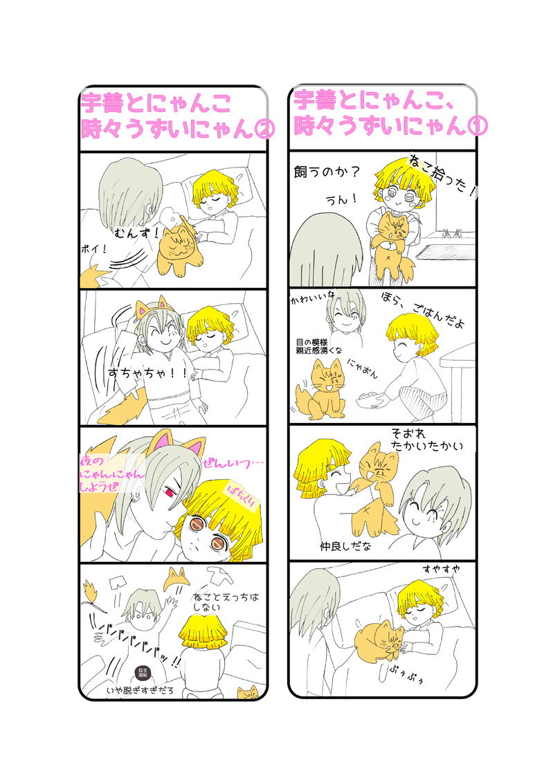 猫を飼い始めた宇善の話。四コマ漫画一枚。