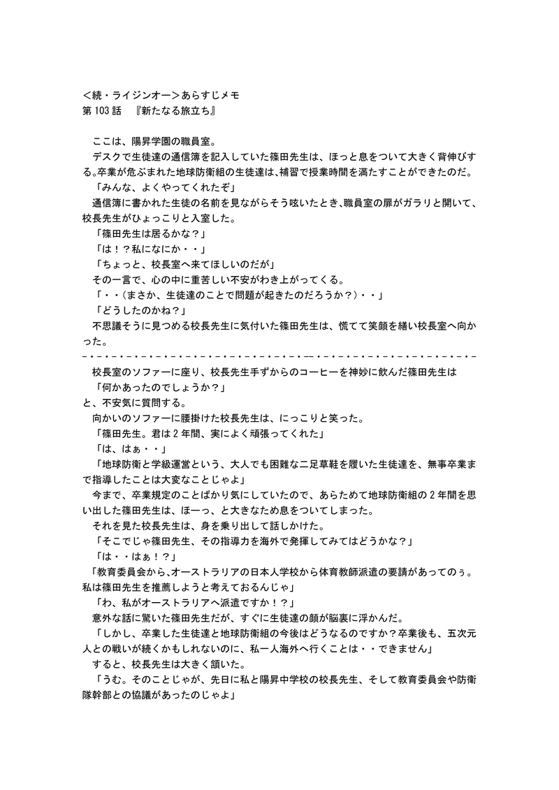 UZ18SnZ7Z3G0v0t☆quiet followMEMO<続・ライジンオー>あらすじメモ第103話『新たなる旅立ち』最終回直前に、邪悪獣の登場しないお話が設定されていたので、だいぶ悩みました。私なりの解釈です。今回をもって、<続・ライジンオー>の贋作はおしまいです。ありがとうございました。 show all(+3 images) Tap to full screen (size:1240x1754).Repost is prohibited Let's send reactions! freqpopularsnackothersPayment processing Replies from the creator Follow creator you care about!☆quiet follow UZ18SnZ7Z3G0v0tDONE「絶対無敵ライジンオー」の作文第20話エピローグ『僕たちは地球防衛組』(完結)作者が初めてつくった<二次創作>の修正版です。興味のある方はご覧ください。パスワードはraijinohです。 7 UZ18SnZ7Z3G0v0tDONE「絶対無敵ライジンオー」の作文第19話第6章 帰還『友達』作者が初めてつくった<二次創作>の修正版です。興味のある方はご覧ください。パスワードはraijinohです。 4 UZ18SnZ7Z3G0v0tDONE「絶対無敵ライジンオー」の作文第18話第6章 帰還『ふたたび、令和元年(2019)7月20日 土曜日』作者が初めてつくった<二次創作>の修正版です。興味のある方はご覧ください。パスワードはraijinohです。 8 UZ18SnZ7Z3G0v0tCAN’T MAKE飛鳥君の誕生日の絵が間に合わなかったので、先日描いた「仁マリ」に、過去画像を改造して合わせたもの。れいこに怒られるので、パスワードを設定した。PASS<あすマリ> 2 UZ18SnZ7Z3G0v0tDONEこちらは、表情を変えて整備したものをのっける。 UZ18SnZ7Z3G0v0tCAN’T MAKE恐らく、最初で最後の「大人の飛鳥とマリア」。参考にした絵が<ロー・ポニー・テイル>だったので、それを範にした。pass wardは<あすマリ>である。