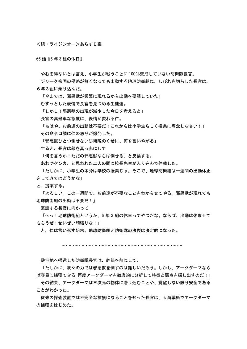 UZ18SnZ7Z3G0v0t☆quiet followMEMO<続ライジンオー>66話「6年3組の休日」のあらすじ案。ツイッターでダラダラツイートすると危険なので、こちらにのっけてみた show all(+2 images) Tap to full screen (size:1240x1754).Repost is prohibited Let's send reactions! freqpopularsnackothersPayment processing Replies from the creator Follow creator you care about!☆quiet follow UZ18SnZ7Z3G0v0tDONE「絶対無敵ライジンオー」の作文第20話エピローグ『僕たちは地球防衛組』(完結)作者が初めてつくった<二次創作>の修正版です。興味のある方はご覧ください。パスワードはraijinohです。 7 UZ18SnZ7Z3G0v0tDONE「絶対無敵ライジンオー」の作文第19話第6章 帰還『友達』作者が初めてつくった<二次創作>の修正版です。興味のある方はご覧ください。パスワードはraijinohです。 4 UZ18SnZ7Z3G0v0tDONE「絶対無敵ライジンオー」の作文第18話第6章 帰還『ふたたび、令和元年(2019)7月20日 土曜日』作者が初めてつくった<二次創作>の修正版です。興味のある方はご覧ください。パスワードはraijinohです。 8 UZ18SnZ7Z3G0v0tCAN’T MAKE飛鳥君の誕生日の絵が間に合わなかったので、先日描いた「仁マリ」に、過去画像を改造して合わせたもの。れいこに怒られるので、パスワードを設定した。PASS<あすマリ> 2 UZ18SnZ7Z3G0v0tDONEこちらは、表情を変えて整備したものをのっける。 UZ18SnZ7Z3G0v0tCAN’T MAKE恐らく、最初で最後の「大人の飛鳥とマリア」。参考にした絵が<ロー・ポニー・テイル>だったので、それを範にした。pass wardは<あすマリ>である。