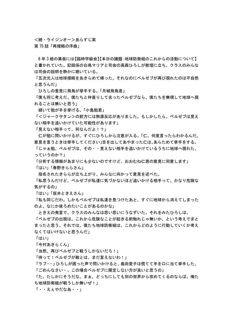 UZ18SnZ7Z3G0v0t☆quiet followMEMO<続・ライジンオー>あらすじ案第75話 『再侵略の序曲』総集編と言いがたい内容になりました。こちらにのっけます。 show all(+3 images) Tap to full screen (size:1240x1754).Repost is prohibited Let's send reactions! freqpopularsnackothersPayment processing Replies from the creator Follow creator you care about!☆quiet follow UZ18SnZ7Z3G0v0tDONE「絶対無敵ライジンオー」の作文第20話エピローグ『僕たちは地球防衛組』(完結)作者が初めてつくった<二次創作>の修正版です。興味のある方はご覧ください。パスワードはraijinohです。 7 UZ18SnZ7Z3G0v0tDONE「絶対無敵ライジンオー」の作文第19話第6章 帰還『友達』作者が初めてつくった<二次創作>の修正版です。興味のある方はご覧ください。パスワードはraijinohです。 4 UZ18SnZ7Z3G0v0tDONE「絶対無敵ライジンオー」の作文第18話第6章 帰還『ふたたび、令和元年(2019)7月20日 土曜日』作者が初めてつくった<二次創作>の修正版です。興味のある方はご覧ください。パスワードはraijinohです。 8 UZ18SnZ7Z3G0v0tCAN’T MAKE飛鳥君の誕生日の絵が間に合わなかったので、先日描いた「仁マリ」に、過去画像を改造して合わせたもの。れいこに怒られるので、パスワードを設定した。PASS<あすマリ> 2 UZ18SnZ7Z3G0v0tDONEこちらは、表情を変えて整備したものをのっける。 UZ18SnZ7Z3G0v0tCAN’T MAKE恐らく、最初で最後の「大人の飛鳥とマリア」。参考にした絵が<ロー・ポニー・テイル>だったので、それを範にした。pass wardは<あすマリ>である。