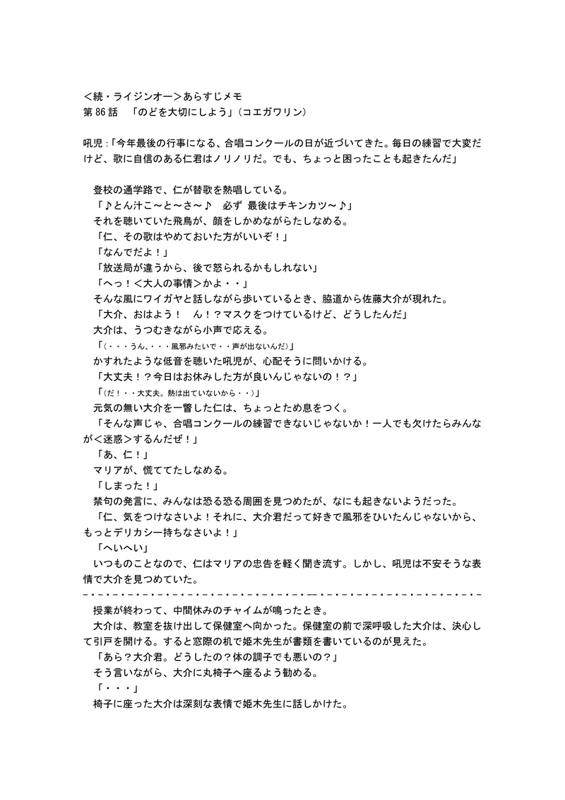 UZ18SnZ7Z3G0v0t☆quiet followMEMO<続・ライジンオー>あらすじ案第86話 『のどを大切にしよう』「少年時代真っ盛りにある、生き生きとした子供たちを描いて」いた程しか資料がないので、ほぼ手探りで書いてみました。 show all(+4 images) Tap to full screen (size:1240x1754).Repost is prohibited Let's send reactions! freqpopularsnackothersPayment processing Replies from the creator Follow creator you care about!☆quiet follow UZ18SnZ7Z3G0v0tDONE「絶対無敵ライジンオー」の作文第20話エピローグ『僕たちは地球防衛組』(完結)作者が初めてつくった<二次創作>の修正版です。興味のある方はご覧ください。パスワードはraijinohです。 7 UZ18SnZ7Z3G0v0tDONE「絶対無敵ライジンオー」の作文第19話第6章 帰還『友達』作者が初めてつくった<二次創作>の修正版です。興味のある方はご覧ください。パスワードはraijinohです。 4 UZ18SnZ7Z3G0v0tDONE「絶対無敵ライジンオー」の作文第18話第6章 帰還『ふたたび、令和元年(2019)7月20日 土曜日』作者が初めてつくった<二次創作>の修正版です。興味のある方はご覧ください。パスワードはraijinohです。 8 UZ18SnZ7Z3G0v0tCAN’T MAKE飛鳥君の誕生日の絵が間に合わなかったので、先日描いた「仁マリ」に、過去画像を改造して合わせたもの。れいこに怒られるので、パスワードを設定した。PASS<あすマリ> 2 UZ18SnZ7Z3G0v0tDONEこちらは、表情を変えて整備したものをのっける。 UZ18SnZ7Z3G0v0tCAN’T MAKE恐らく、最初で最後の「大人の飛鳥とマリア」。参考にした絵が<ロー・ポニー・テイル>だったので、それを範にした。pass wardは<あすマリ>である。