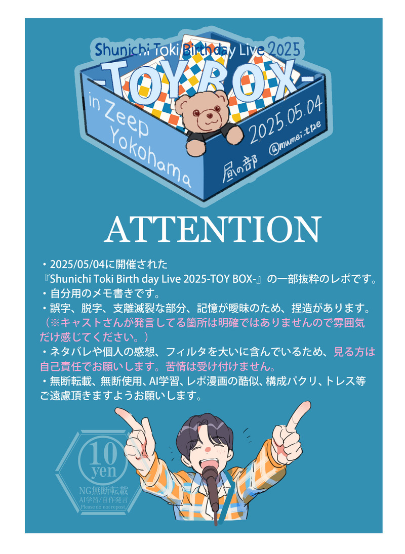 mumei_t12e☆quiet followMEMO2025年5月4日に開催されたbirthdayliveのレポです。注意事項をよく読み大丈夫な方のみ見てください。 #土岐隼一 hayatoToki show all(+6 images) Tap to full screen (size:2113x2893).Repost is prohibited Let's send reactions! freqpopularsnackothersPayment processing Replies from the creator Follow creator you care about!☆quiet follow mumei_t12eDOODLE土岐さん詰め合わせイラストログ25 27 mumei_t12eMEMOしーぷい39回のイベントレポです注意事項をよく読み大丈夫の方のみお進みください 3 mumei_t12eMEMO2025年5月4日に開催されたbirthdayliveのレポです。注意事項をよく読み大丈夫な方のみ見てください。 7 mumei_t12eDOODLE土岐さん詰め合わせイラストログ24 22 mumei_t12eMEMO朗読劇の好きな所ピックアップ 2 mumei_t12eDOODLE土岐さん詰め合わせイラストログ23 24 related works mumei_t12eDOODLE土岐さん詰め合わせイラストログ20 24 mumei_t12eMEMO土岐隼一さんTime With Youの公開イベント抜粋レポ。注意事項をよく読んで大丈夫な方だけお進みください。 3 mumei_t12eDOODLE土岐さんログ詰め合わせ11映像やラジオのネタバレがあるのでご注意ください 21 mumei_t12eDOODLE土岐さん詰め合わせログ13映像やイベントのネタバレがあるのでご注意ください。 22 mumei_t12eDOODLE土岐隼一さんの写真集の感想です。注意事項をよく読んで大丈夫な方だけ見てください。誤字脱字も多分あるので見つけてもスルーしてください 3 mumei_t12eMEMO王様ジャングル298回(土岐さん/濱野さんゲスト)のレポ漫画です。注意事項をよく読んで大丈夫な方だけみてください。こちらは個人の対面レポもあるためパスワード制となってます。【パスワード】王様ジャングル王国の国王様ポーヴォワール・チェザーレ3世のニックネームは?(ひらがなで4文字) 10 坂島(@sinps1212)MEMO土岐隼一特製トレーディングカード「GAZE」で遊びたい人向けの、アレンジ(非公式)ルールを作りました。ファンによる個人作成のため、公式様への問い合わせなどはせず、個人の範囲で遊んで下さい。プレイマットはA4サイズで印刷してください。線画の方はアレンジしたい人向けです。連絡なしで自由に使って下さい。表は勝ち負けの判定が分からない人向け。 8 mumei_t12eDOODLE土岐さんの詰め合わせログ17映像やイベントのネタバレがあるので見る方はご注意ください 23 mumei_t12eDOODLE土岐さんの詰め合わせログ18イベントや映像のネタバレあるので見る方はご注意ください。 22 recommended works mumei_t12eMEMOトキノワオンラインイベントレポート(再投稿)注意事項をよく読んで大丈夫な方だけ見てください。 4 mumei_t12eMEMO土岐隼一さんの2021ニューイヤートーク&ミニライブのレポ漫画です。注意事項をよく読んで大丈夫な方だけお進みください。#土岐ニューイヤー 4 mumei_t12eMEMOニコ生で見たSideMライブ2019の感想イラストです(再投稿)書き手のフィルタがかかった感想になります。注意事項をよく読んで大丈夫な方だけ見てください。 3 mumei_t12eDOODLE土岐さんログ詰め合わせ4(再投稿)映像やラジオのネタバレがあるのでご注意ください 21 mumei_t12eMEMO土岐さんの2021リーディングライブの抜粋レポです(再投稿)注意事項をよく読んで大丈夫な方だけお進みください。 4 mumei_t12eMEMO土岐隼一さんと寺島惇太さんのコラボライブ2021抜粋レポです(再投稿)注意事項を読んで大丈夫な方だけお進みください。 4 mumei_t12eMEMO2021年に行われたSideMのライブレポ抜粋(アルテ中心)の再投稿+@注意事項をよく読んで大丈夫な方だけお進みください。 7 mumei_t12eDOODLE土岐さんログ詰め合わせ8(再投稿)映像やラジオのネタバレがあるのでご注意ください 17 mumei_t12eMEMO土岐さんの2022年1stライブ抜粋レポ(再投稿)注意事項をよく読んで大丈夫な方のみ見てください。 7