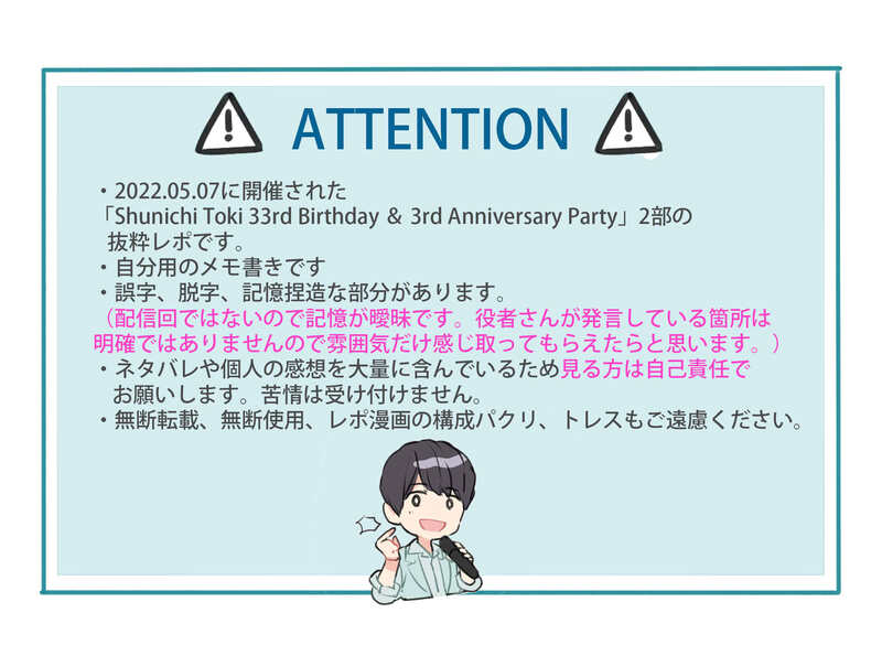 mumei_t12e☆quiet followMEMO土岐さんの2022年バースデーイベント抜粋レポ(二部の回/再投稿)注意事項をよく読んで大丈夫な方のみ見てください。 #土岐隼一 hayatoToki show all(+4 images) Tap to full screen (size:2021x1478).Repost is prohibited Let's send reactions! freqpopularsnackothersPayment processing Replies from the creator Follow creator you care about!☆quiet follow mumei_t12eDOODLE土岐さん詰め合わせイラストログ25 27 mumei_t12eMEMOしーぷい39回のイベントレポです注意事項をよく読み大丈夫の方のみお進みください 3 mumei_t12eMEMO2025年5月4日に開催されたbirthdayliveのレポです。注意事項をよく読み大丈夫な方のみ見てください。 7 mumei_t12eDOODLE土岐さん詰め合わせイラストログ24 22 mumei_t12eMEMO朗読劇の好きな所ピックアップ 2 mumei_t12eDOODLE土岐さん詰め合わせイラストログ23 24 related works mumei_t12eDOODLE土岐さんログ詰め合わせ11映像やラジオのネタバレがあるのでご注意ください 21 mumei_t12eDOODLE土岐さんの詰め合わせログ17映像やイベントのネタバレがあるので見る方はご注意ください 23 mumei_t12eDOODLE土岐さん詰め合わせイラストログ20 24 mumei_t12eDOODLE土岐さんの詰め合わせログ18イベントや映像のネタバレあるので見る方はご注意ください。 22 mumei_t12eMEMO王様ジャングル298回(土岐さん/濱野さんゲスト)のレポ漫画です。注意事項をよく読んで大丈夫な方だけみてください。こちらは個人の対面レポもあるためパスワード制となってます。【パスワード】王様ジャングル王国の国王様ポーヴォワール・チェザーレ3世のニックネームは?(ひらがなで4文字) 10 mumei_t12eDOODLE土岐さん詰め合わせログ13映像やイベントのネタバレがあるのでご注意ください。 22 mumei_t12eDOODLE土岐隼一さんの写真集の感想です。注意事項をよく読んで大丈夫な方だけ見てください。誤字脱字も多分あるので見つけてもスルーしてください 3 mumei_t12eMEMO土岐隼一さんTime With Youの公開イベント抜粋レポ。注意事項をよく読んで大丈夫な方だけお進みください。 3 坂島(@sinps1212)MEMO土岐隼一特製トレーディングカード「GAZE」で遊びたい人向けの、アレンジ(非公式)ルールを作りました。ファンによる個人作成のため、公式様への問い合わせなどはせず、個人の範囲で遊んで下さい。プレイマットはA4サイズで印刷してください。線画の方はアレンジしたい人向けです。連絡なしで自由に使って下さい。表は勝ち負けの判定が分からない人向け。 8 recommended works mumei_t12eMEMOトキノワオンラインイベントレポート(再投稿)注意事項をよく読んで大丈夫な方だけ見てください。 4 mumei_t12eMEMO土岐隼一さんの2021ニューイヤートーク&ミニライブのレポ漫画です。注意事項をよく読んで大丈夫な方だけお進みください。#土岐ニューイヤー 4 mumei_t12eMEMOニコ生で見たSideMライブ2019の感想イラストです(再投稿)書き手のフィルタがかかった感想になります。注意事項をよく読んで大丈夫な方だけ見てください。 3 mumei_t12eMEMOトキノワ5周年特別営業オンライン配信のレポイラスト(再投稿)注意事項をよく読んで大丈夫な方だけ見てください。 3 mumei_t12eDOODLE土岐さんログ詰め合わせ6(再投稿)映像やラジオのネタバレがあるのでご注意ください 21 mumei_t12eMEMO2021年に行われたSideMのライブレポ抜粋(アルテ中心)の再投稿+@注意事項をよく読んで大丈夫な方だけお進みください。 7 mumei_t12eDOODLE土岐さんログ詰め合わせ8(再投稿)映像やラジオのネタバレがあるのでご注意ください 17 mumei_t12eDOODLE土岐さんログ詰め合わせ10(再投稿)映像やラジオのネタバレがあるのでご注意ください 20 mumei_t12eMEMO喫茶トキノワ300回特別配信(再投稿)注意事項をよく読んで大丈夫な方のみお進みください。 6