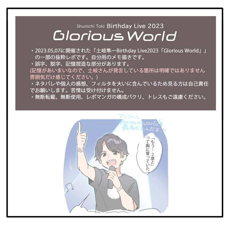 mumei_t12e☆quiet followMEMO2023年05月07日に開催された土岐さんの誕生日ライブ抜粋イラストです。注意事項をよく読んで大丈夫な方のみ見てください #土岐隼一 hayatoToki show all(+5 images) Tap to full screen (size:1720x1700).Repost is prohibited Let's send reactions! freqpopularsnackothersPayment processing Replies from the creator Follow creator you care about!☆quiet follow mumei_t12eDOODLE土岐さん詰め合わせイラストログ25 27 mumei_t12eMEMOしーぷい39回のイベントレポです注意事項をよく読み大丈夫の方のみお進みください 3 mumei_t12eMEMO2025年5月4日に開催されたbirthdayliveのレポです。注意事項をよく読み大丈夫な方のみ見てください。 7 mumei_t12eDOODLE土岐さん詰め合わせイラストログ24 22 mumei_t12eMEMO朗読劇の好きな所ピックアップ 2 mumei_t12eDOODLE土岐さん詰め合わせイラストログ23 24 related works mumei_t12eMEMO土岐隼一さんTime With Youの公開イベント抜粋レポ。注意事項をよく読んで大丈夫な方だけお進みください。 3 坂島(@sinps1212)MEMO土岐隼一特製トレーディングカード「GAZE」で遊びたい人向けの、アレンジ(非公式)ルールを作りました。ファンによる個人作成のため、公式様への問い合わせなどはせず、個人の範囲で遊んで下さい。プレイマットはA4サイズで印刷してください。線画の方はアレンジしたい人向けです。連絡なしで自由に使って下さい。表は勝ち負けの判定が分からない人向け。 8 mumei_t12eDOODLE土岐さん詰め合わせログ13映像やイベントのネタバレがあるのでご注意ください。 22 mumei_t12eDOODLE土岐さんの詰め合わせログ17映像やイベントのネタバレがあるので見る方はご注意ください 23 mumei_t12eMEMO王様ジャングル298回(土岐さん/濱野さんゲスト)のレポ漫画です。注意事項をよく読んで大丈夫な方だけみてください。こちらは個人の対面レポもあるためパスワード制となってます。【パスワード】王様ジャングル王国の国王様ポーヴォワール・チェザーレ3世のニックネームは?(ひらがなで4文字) 10 mumei_t12eDOODLE土岐さん詰め合わせイラストログ20 24 mumei_t12eDOODLE土岐隼一さんの写真集の感想です。注意事項をよく読んで大丈夫な方だけ見てください。誤字脱字も多分あるので見つけてもスルーしてください 3 mumei_t12eDOODLE土岐さんの詰め合わせログ18イベントや映像のネタバレあるので見る方はご注意ください。 22 mumei_t12eDOODLE土岐さんログ詰め合わせ11映像やラジオのネタバレがあるのでご注意ください 21 recommended works 坂島(@sinps1212)MEMO土岐隼一特製トレーディングカード「GAZE」で遊びたい人向けの、アレンジ(非公式)ルールを作りました。ファンによる個人作成のため、公式様への問い合わせなどはせず、個人の範囲で遊んで下さい。プレイマットはA4サイズで印刷してください。線画の方はアレンジしたい人向けです。連絡なしで自由に使って下さい。表は勝ち負けの判定が分からない人向け。 8 mumei_t12eMEMOトキノワオンラインイベントレポート(再投稿)注意事項をよく読んで大丈夫な方だけ見てください。 4 mumei_t12eMEMO土岐隼一さんの2021ニューイヤートーク&ミニライブのレポ漫画です。注意事項をよく読んで大丈夫な方だけお進みください。#土岐ニューイヤー 4 mumei_t12eDOODLE土岐さんログ詰め合わせ3(再投稿)映像やラジオのネタバレがあるのでご注意ください 23 mumei_t12eDOODLE土岐さんログ詰め合わせ4(再投稿)映像やラジオのネタバレがあるのでご注意ください 21 mumei_t12eMEMO土岐隼一さんと寺島惇太さんのコラボライブ2021抜粋レポです(再投稿)注意事項を読んで大丈夫な方だけお進みください。 4 mumei_t12eMEMO2021年に行われたSideMのライブレポ抜粋(アルテ中心)の再投稿+@注意事項をよく読んで大丈夫な方だけお進みください。 7 mumei_t12eDOODLE土岐さんログ詰め合わせ10(再投稿)映像やラジオのネタバレがあるのでご注意ください 20 mumei_t12eDOODLE土岐さんログ詰め合わせ11映像やラジオのネタバレがあるのでご注意ください 21