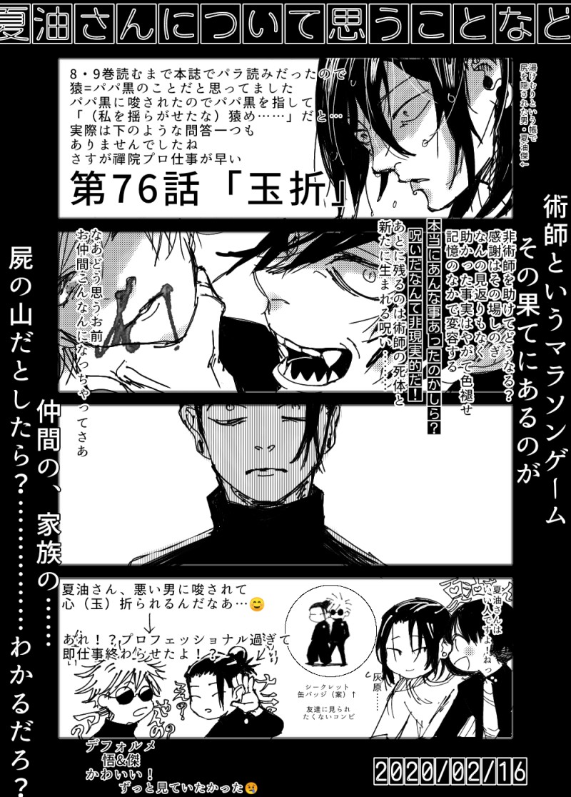 高専夏油さんの描写で呪術廻戦はハマったのでそれまでパラ読みでした。初めて読んだとき五条先生は敵か味方かわからない、とにかく強パワーで掻き回す主人公側からすると悩みの種みたいな人だと思ってましたもん、なんか宙浮いてたし……