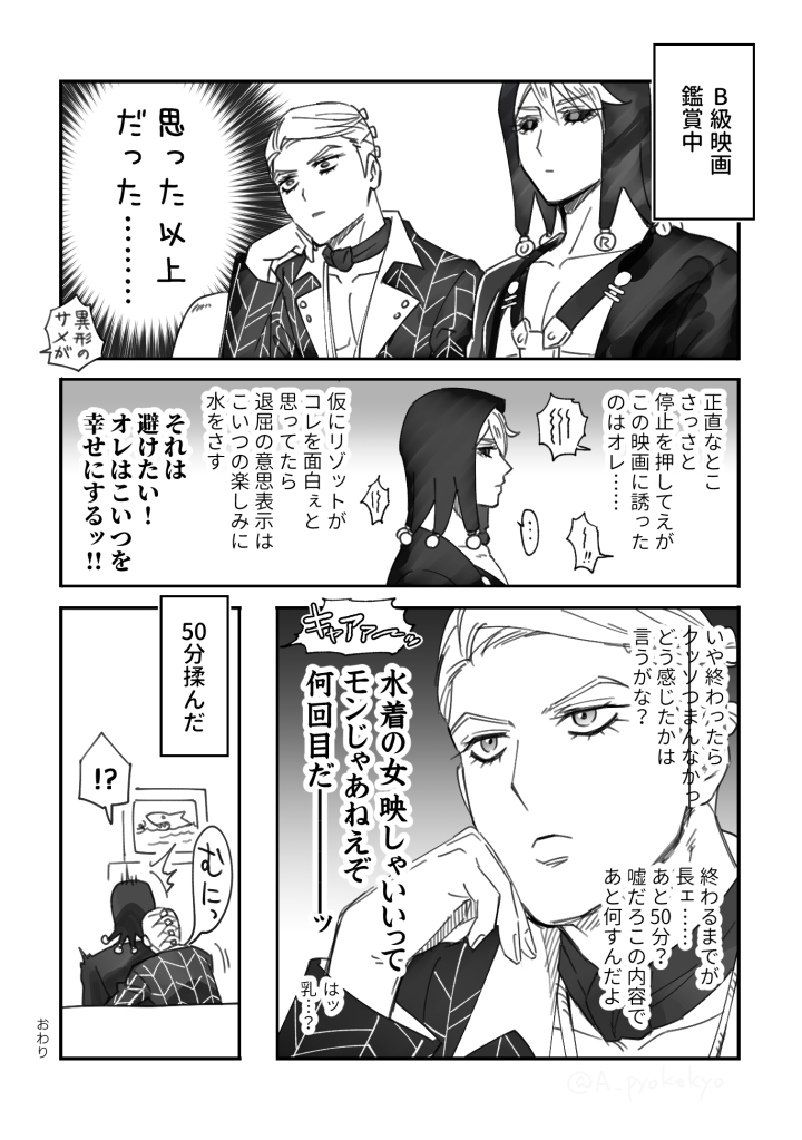 A_pyokekyo☆quiet followDOODLEサメ映画観てるプリゾ。(5/30) Tap to full screen (size:720x1023).Repost is prohibited Let's send reactions! freqpopularsnackothersPayment processing Replies from the creator Follow creator you care about!☆quiet follow A_pyokekyoINFOお久しぶりですーで突然ですが、来月20日くらいにこちらのポイピクアカウントは消そうと思います。 何も描けずに放置して〇年、あまりにも往生際が悪いのでようやくですが! ログ見返してるだけでもじわっと…ムラッとするんですが…ひとまずこの場は…去る…! また何かしら描けたらまずはpixivにぽいぽいしますね。ほったらかしにもかかわらずスタンプくださってありがとうございます!嬉しゅうございました…。 A_pyokekyoREHABILI(2024/5/12)えろさがまだまだなのでR指定を積極的に練習しようかと思っています。ピッシブにエア新刊出してきたよ。エアじゃないのもスデ終を目指せ。 A_pyokekyoDOODLE(2024/5/8)ペンやら何やらの練習かねてお遊びです。萌え袖風りぞさん。いける。他に未完成の小ネタ見てたら過去の私が私好みの物描いてるじゃん…ってなったので描けそうなのはそのうち!清書を!単発絵だけでは寂しい。 A_pyokekyoDOODLE(2024/4/30)★最近思うこと・もうすぐイベントですねいいなあ!私はネーム練り直してるところ!いつになるやら!・交流したぁい・久々にアニメ観たらやっぱり非常に良かったです。皆かっこいいー! 2 A_pyokekyoDONE拷問中のモブに服をパァンされるリゾットさん♀ の話。(2024/4/12) 5 A_pyokekyoDOODLEついった消した途端に寂しくなったのでお蔵入りしてたラフぽいぽい。メ+リ(出したかどうか記憶が朧気)、帰宅時のマンマ、長髪りぞさんらくがき、の単発三つ。ひー寂しい! 3