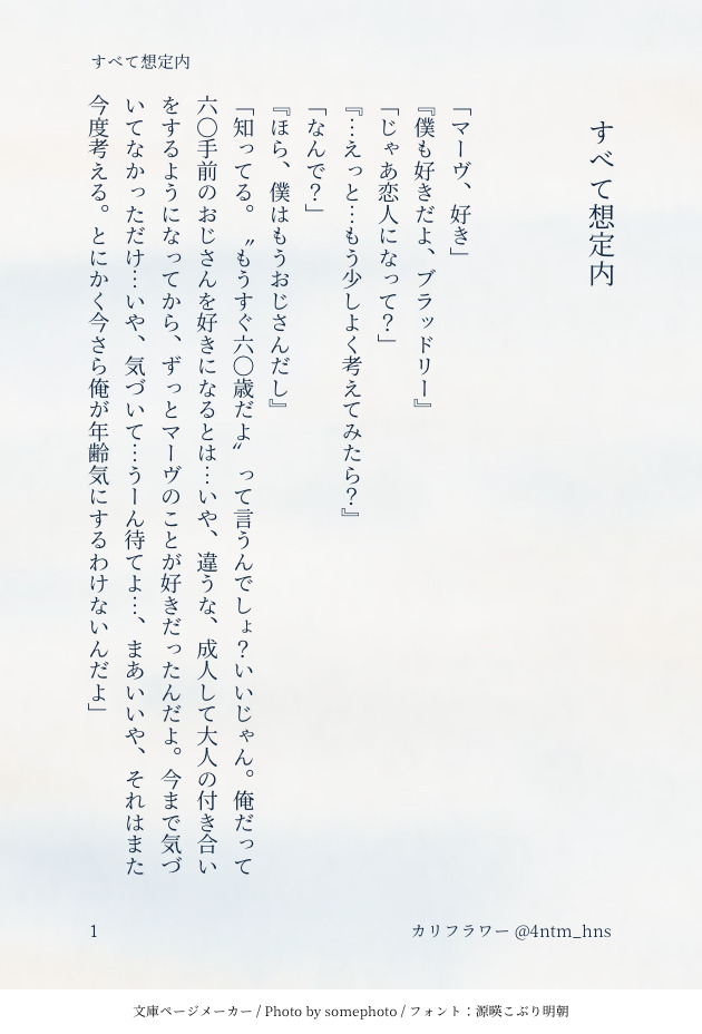 カリフラワー☆quiet followDONEルスマヴェ成立を狙うルスのルス→マヴェの短い話です。地の文を書くのが苦手だな〜と思ったところから書き始めた変な話です。本当に変です。クオリティもハードルも常に低いです…会話が成立してなかったり、文の中で"マーヴ"を連発するルスは個人的な好みです🐓✊『すべて想定内』 #ルスマヴェ rousmavet #roosmav show all(+5 images) Tap to full screen (size:630x928).Repost is prohibited Let's send reactions! freqpopularsnackothersPayment processing Replies from the creator Follow creator you care about!☆quiet follow カリフラワーDONEルマランド展示その③『Dec. 1st』タイトル通り、12月1日の話。同棲ルスマヴェと同じアースですが、展示①より数年の時間が進んでいます(時系列的には今月の想定で、Twitterの同棲ルマ投稿の合間に起きた話です)ややこしくてすみません。パスワード🗝️→ イベント初日(mm/dd) 2719 カリフラワーDONEルマランド展示その②「もしも」の質問をしてみるルスの短すぎる話です。※これもゆる甘です(というかゆるいだけかもしれない…)※パスワード🗝️→ イベント初日(mm/dd) 2449 カリフラワーDONEルマランド展示その①同棲しているルスマヴェの短編集です。本に収録していない、書き下ろしになります。※ゆる甘ルスマヴェです、たいしたことは起きません※パスワード🗝️→ イベント初日(mm/dd) 8119 カリフラワーDONEルマランド2412新刊サンプルいつもの同棲ルスマヴェ短編集です。「ゆるゆるで甘い2人の日常」は私の個人的な好みです。何も起きないです、すみません。 6605 カリフラワーDONEマ右ワンライ/ルスマヴェ/お題「歌声」わかりづらいですが、段落ごとに時間が進んでます。本当にわかりづらいです。反省してます。 4107 カリフラワーDONEマ右ワンライ/いずれルスマヴェになるルス→マヴェ/お題「懐かしい」TVを観ている一人きりのルス。 2889 related works booboofish88DOODLERoosMav🐓🐺🔞 18↑?(y/n) カリフラワーDONEマ右ワンライ/お題「いい子」「悪い子」たまらんくらい最高のお題だったのでどちらも使いました 2987 カリフラワーDONEマ右ワンライ/いずれルスマヴェになるルス→マヴェ/お題「懐かしい」TVを観ている一人きりのルス。 2889 rayliugogoDOODLEDoodleルスマヴェ🐔🐺🔞👄pw英3文字+🐔is dagger ? カリフラワーDONEマ右ワンライ/ルスマヴェ/お題「夢」ルスがいない方が夢、ルスがいる方が現実!👩🏻🏫歯磨く前に飲み物飲めるタイプなので2人にも飲ませた☕️ 3831 カリフラワーDONEマ右ワンドロワンライのお題「電子機器」をお借りして書きました。一緒に暮らそうよ系ルスマヴェです。 4298 カリフラワーDONEマ右ワンライ/ルスマヴェ/お題「歌声」わかりづらいですが、段落ごとに時間が進んでます。本当にわかりづらいです。反省してます。 4107 em(emcat)DOODLEroosmav暑い日pw2人の機体番号 カリフラワーDONEルスマヴェ/お題「長い夜」離れて暮らす2人。ルスが電話越しにマーヴと夜を過ごそうとする薄い話です🐓📱🐺いつものこととはいえ、回を重ねるごとに薄くなっている気がします…🥲(やはり段落字下げができず読みづらいです、すみません…) 3834 recommended works 夏の枝蛙DOODLE にくきゅうDONEハンルス前提のマヴェとルスのまんがです 親子かわいいよ~~~~ 2 カリフラワーDONEルスマヴェ。付き合ってます。アイス食べに行くだけのゆるい話です。『アイスクリーム日和』 21 灯(落書き初心者です)DONE🔞です。0917ムで頒布するルスマヴェ🐔🐺新刊のサンプルです!ほんとに、ほんとに何でも許せる方のみでお願いします!!!A5サイズ40ページ(表紙込み)。イベント価格で600円です。おまけとしてポスカとペーパーが付きます(/ω\*)どうぞよろしくお願いします🙇♀️#roosmav※18↑?(y/n)+例の数字 12 west0710westDONEルスマヴェ🐔🐺#roosmav【漫画】痴話喧嘩 2 カリフラワーDONEマ右ワンライ/ルスマヴェ/お題「勝負」本編のビーチフットボールを思い出して読んでください🏖️🏈マーヴの彼氏になることは、世界中の人たちとの勝ち抜き戦✊💥🔥(byルス) 3678 カリフラワーDONEマ右ワンライ/ルスマヴェ/お題「お菓子」「悪戯」ハロウィン話を一つは書いてみたかったので書きましたが、全然ハロウィンっぽくない話になりました。仮装すらしてません。これが私のハロウィンです。 4916 da079002DOODLE 21 カリフラワーMENU12/17の新刊の書き下ろし部分サンプルです。話のタイトルは『Mav or Pete』です。マーヴとピート、どっちで呼ばれたい?という軽い話。↓以下新刊の詳細↓・『Rapture』・文庫サイズ/330ページ程度・全年齢向け・900円(予定)・web再録中心、書き下ろし2本収録ご参考になれば幸いです🐓🐺本になっても変わらず低ハードルでご覧ください。 2662