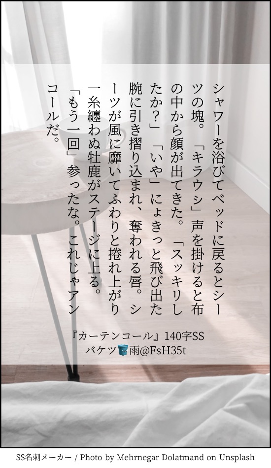 バケツ🪣☆quiet followREHABILI毎日140字。借りたお題→ https://shindanmaker.com/375517 #門キラ show all(+18 images) Tap to full screen (size:550x950).Repost is prohibited Let's send reactions! freqpopularsnackothersPayment processing Replies from the creator Follow creator you care about!☆quiet follow バケツ🪣DONEきやれん。原作軸🔞Aひれさんの最高萌えイラストから一気に燃え滾って書かせていただきました!ありがとうございます!セフレの二人がお外でヤッてるだけの話。セフレなので付き合っていないし、ノンケのきーやが酷い男。でも好きというマエの話。さほど明るくはない。18↑? 7038 バケツ🪣MENU10月27日スパーク塚橋 サンプル冒頭の部分と真ん中のちょっと♡な部分。記憶有転生現パロ。警察官の和さんが半グレヤンキーのタロちゃんと再会する話。本文🔞有。ちょっとだけ性的なシーンあるので18↑? 3394 バケツ🪣SPUR MEきやれん。現パロ。同じ授業受けてる学生の二人の夏休み。れんたがちょっとセクシーなお店でバイトしている。らしい。それっぽい終わり方しているけどそれっぽく終わります。 5103 バケツ🪣TRAINING現パロ学パロ鳴子部隊。記憶あり転生した鳴子部隊が同じ大学で再開する話。お盆休みに集まるみんななサ◯ゼ飲みするだけの話。そういう感じ。 4661 バケツ🪣TRAININGきや←れん強めのきやれん。現パロ。ナチュラルに会社員の鳴子部隊。web会議とニンニク。 2255 バケツ🪣TRAINING田櫂もどき。練習。 1886 related works くいっくすたDOODLE今さらながら5月、6月についったに載せた140字や短いものをまとめました。あんまりなかった…。3月、4月の方にも間違って入ってるのがひとつあります。東の祭の話はインテが羨ましくて書いたちょっとお気に入り。ちょうど今も祭の後ですし! 19 かしおりDONE9/24tnkn3にて無料配布した門キラ本生臭坊✳️主×未亡🦌人パロです!(1ページめの注意書きをご覧くださいませ)お手に取ってくださりありがとうございました〜🥺! 9 _uchida13DONE門キラ原作軸 4 シオ原DOODLE色差分も気に入ってるから見て mochifuREHABILI現パロ。道内在住、喫茶店店主のキラウシ(37)と居候のカドクラ(49)が、ふたりで赤ん坊の面倒をみる話です。(※門キラです。付き合ってます)北海道の地理がわかりません。方言も雰囲気です。(本文には出てきませんがキラウシくんの父親は他界しており、喫茶店は元は父親の店です) 33 _uchida13DONEキャバクラにいるキラウㇱと一緒にいる門の独白(現パロ) 1029 上课睡觉人DOODLE你别再画这种东西了 6 とみいMOURNING 2 書(格納庫)SPOILERようやく本誌に追いついた記念の絵(最新話というわけでもないですが) 2 recommended works notsimantogawaDONE1/15(土)開催門キラすごろく大会が楽しみすぎて描きました。18.家が突然停電したらどうする?まだお互いの家を1〜2度行き来しはじめたぐらいの2人です。 2 小嶋家DONE【門キラ】楽するなカドクラ〜(騎※じょ〜い) 小嶋家DONE【現パロ】おちう こなつ🦌REHABILI門倉誕生日おめでとう!遅刻アップの『門出きらめく祝い事』門キラ5作目 5 ミシマ コロモデDOODLE門キラっていいな とろりDONE門キラ本表紙🥲表紙も中身も初めて使う装丁選んだのでどんな感じになるかドキドキ〜! 3737_gkDOODLE門倉とキラウシの夜18歳以上ですか?(yes/no) 3 fujihaya00117DONE門キラR18らくがきえろマンガ風です。唐突な合体。性器描写があるのでお気を付けて・・・。ちゃんと塗り分けてないので見にくいです😓オチてんだかオチてないんだか謎ですが、オチウではある・・・ くいっくすたMOURNING明治軸門キラ ゆきあかれぬアカンコのすぐ後くらいのつもり。あるきっかけで✳️がやや不穏なことを考えたり言ったりするも🦌が光で覆っちゃう話。出てくる他界観については複数文献の見解が混じっており、固定的なものではありません 7