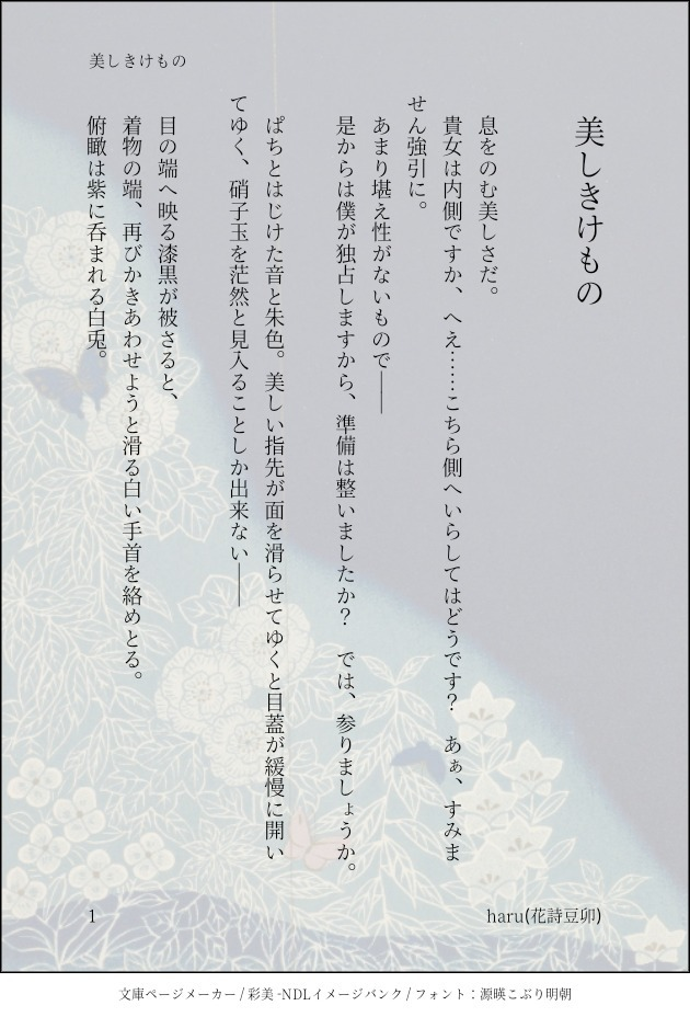 haru☆quiet followDOODLE【美しきけもの】少し書き加えると妖しくなるやつ。【美しき舞台のとりこ】元の文。白燕尾服と黒着流しの夜ノ介くんをイメージ。 #柊夜ノ介 hiiragiYonosuke show all(+1 images) Tap to full screen (size:630x928).Repost is prohibited Let's send reactions! freqpopularsnackothersPayment processing Replies from the creator Follow creator you care about!☆quiet follow haruDONE【羽根のまいおりる】エアコレ2024冬展示小説高校二年生生徒会活動。クリスマスパーティーの準備をするやのマリのこと。マリィは小波美奈子。モブキャラ沢山出ます。※お題企画『クリスマスカード』参加作品。 7 haruDONE🍀GS WORDS GSオンリー展示小説昨年12月2日に開催されたイベント【柊座長誕生日公演】の企画。舞台衣装展で書いたイメージ小説です。舞台上の夜ノ介くん、と思って読んでいただければと思います。あくまでもイメージですので、暇つぶしの軽い読み物としてぜひ。『怪盗 Scenario』『探偵 clue+note』『ベルボーイ password』 10 haruDONE【1パーセント未満の魔法】柊夜ノ介×マリィエアコレ2024夏展示小説『ひと夜草とあまい林檎』のおまけSSです。■URL(https://www.pixiv.net/novel/show.php?id=22559317)一応R-15ご注意としておきます。マリィは小波美奈子。 6 haruDONE【Circle ~春夏秋冬】あなたにはかなわない2nd stage 展示小説。夜ノ介くんとマリィ。二人がはばたき学園で出会って、積み重ねたひとコマを、季節ごとに切り取りました。書き溜めてたお話&書き下ろしの掌編集になります。※マリィは小波美奈子春 『ゆらす花風ひそやか仕返し』夏 『透明傘』秋 『まだ名前のない物語』冬 『心の地図と映る色』 18 haruDONE【BOOSTのお礼SS】『ある女流作家の演技』柊夜ノ介×マリィ『恋しさ詠む卯の花月夜』へのBOOSTありがとうございました。(要パスワード)*マリィの名前は小波美奈子。 8 haruDONE【生徒会のおいしい時間】柊夜ノ介×マリィ生徒会執行部のひとコマ。ホワイトデーの日のスイートな出来事。モブ視点です。マリィの名前は小波美奈子。(ほぼ、ひと筆書きなので後日直すかも) 4 related works 詩乃(絵置き場)DOODLE初デート記念🥰 haruDONE【水中色チョコレイト】R-18柊夜ノ介×マリィバレンタイン用に書いたR-18ですが、作中はバレンタインの日ではないです。いつか「ハンドル付きオペラグラス」を、お話に入れたかったので。今回書けたの満足しています。【あとがき有り】*2024年9月 修正版 11 haruDONE【胸ポケットの恋ごころ】柊夜ノ介×マリィ似たシチュをいくつか書いている気がしますが。意地悪な夜ノ介くんが大好きです。マリィは小波美奈子。(以前、モブ劇団員が主役の話を書こうと思ってましたが。その一部にと考えてたエピソードです。だから事務スタッフ付いてきてる) 4 Hokkecoffee11201DONE事後シャワー 隅幸(すみゆき)DOODLE夜ノ介さんイノリくん御影先生(仲良しグループ)落書き。グループ可愛い本当に可愛い(*´ω`*) 4 haruDONE【羽根のまいおりる】エアコレ2024冬展示小説高校二年生生徒会活動。クリスマスパーティーの準備をするやのマリのこと。マリィは小波美奈子。モブキャラ沢山出ます。※お題企画『クリスマスカード』参加作品。 7 みやたやDONEバニーの日×ヤノくんが照れてくれそうな服選手権(?) haruDONE【涙色ドロップ】柊夜ノ介×マリィ自作SS「夜照らす光の温度」の番外編になります。最後のページにキャプションあり。大地くんお誕生日おめでとう🌻マリィは小波美奈子。『夜照らす光の温度』※https://www.pixiv.net/novel/show.php?id=21254715 6 みやたやDONE⚠️色々許せる人向け(多分)⚠️バニーの日×やのぴっぴの日✌️🐰✌️ 2 recommended works しゃもの裏SPUR ME続きの続き。七ツ森とマリィが風呂に入ってるだけ漫画①~③。結局R15から抜け出せなかった気がする。スンマセン 3 無理ですDONEサンタ服を着せたかっただけ ナヅナDOODLE七マリ🎂 3 隅幸(すみゆき)DOODLE七ツ森くんのホワイトデーの開始時メッセージ(グループと個別)を聴いて感想落書き。(1日遅刻)(個別は妄想入ってる) 燐音(リンネ)DONE h_qhx5TRAININGやのすけくん描いて見ました🥺 ねりからし2DONE220521 塗ったやつ askmDOODLE大ちゃん練習推し nakusanohanaDONEときメモGS4七マリの指輪の話です。在学中の二人で付き合ってはいません。 3