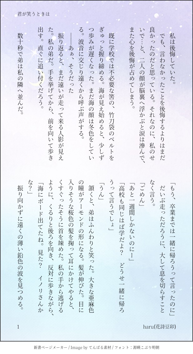 haru☆quiet followDONE【君が笑うときは】柊夜ノ介×マリィ読む人を選びますのでご注意下さい。私的理想のやのマリ像。ほぼファンタジー。マリィは小波美奈子。*エアコレ2023冬 展示小説 #柊夜ノ介 hiiragiYonosuke #やのマリ mariYamato #ときメモGS4 tokiMemoGs4 #エアコレ2023 airCollection2023 show all(+9 images) Tap to full screen (size:618x1132).Repost is prohibited Let's send reactions! freqpopularsnackothersPayment processing Replies from the creator Follow creator you care about!☆quiet follow haruDONE【羽根のまいおりる】エアコレ2024冬展示小説高校二年生生徒会活動。クリスマスパーティーの準備をするやのマリのこと。マリィは小波美奈子。モブキャラ沢山出ます。※お題企画『クリスマスカード』参加作品。 7 haruDONE🍀GS WORDS GSオンリー展示小説昨年12月2日に開催されたイベント【柊座長誕生日公演】の企画。舞台衣装展で書いたイメージ小説です。舞台上の夜ノ介くん、と思って読んでいただければと思います。あくまでもイメージですので、暇つぶしの軽い読み物としてぜひ。『怪盗 Scenario』『探偵 clue+note』『ベルボーイ password』 10 haruDONE【1パーセント未満の魔法】柊夜ノ介×マリィエアコレ2024夏展示小説『ひと夜草とあまい林檎』のおまけSSです。■URL(https://www.pixiv.net/novel/show.php?id=22559317)一応R-15ご注意としておきます。マリィは小波美奈子。 6 haruDONE【Circle ~春夏秋冬】あなたにはかなわない2nd stage 展示小説。夜ノ介くんとマリィ。二人がはばたき学園で出会って、積み重ねたひとコマを、季節ごとに切り取りました。書き溜めてたお話&書き下ろしの掌編集になります。※マリィは小波美奈子春 『ゆらす花風ひそやか仕返し』夏 『透明傘』秋 『まだ名前のない物語』冬 『心の地図と映る色』 18 haruDONE【BOOSTのお礼SS】『ある女流作家の演技』柊夜ノ介×マリィ『恋しさ詠む卯の花月夜』へのBOOSTありがとうございました。(要パスワード)*マリィの名前は小波美奈子。 8 haruDONE【生徒会のおいしい時間】柊夜ノ介×マリィ生徒会執行部のひとコマ。ホワイトデーの日のスイートな出来事。モブ視点です。マリィの名前は小波美奈子。(ほぼ、ひと筆書きなので後日直すかも) 4 related works haruDONE【羽根のまいおりる】エアコレ2024冬展示小説高校二年生生徒会活動。クリスマスパーティーの準備をするやのマリのこと。マリィは小波美奈子。モブキャラ沢山出ます。※お題企画『クリスマスカード』参加作品。 7 haruDONE【胸ポケットの恋ごころ】柊夜ノ介×マリィ似たシチュをいくつか書いている気がしますが。意地悪な夜ノ介くんが大好きです。マリィは小波美奈子。(以前、モブ劇団員が主役の話を書こうと思ってましたが。その一部にと考えてたエピソードです。だから事務スタッフ付いてきてる) 4 meri@GS4PAST【柊主/やのマリ】(リメイク)在学中のお昼休みの一コマのお話。----------2024/01/10 リメイク2022/07/17 エア♡コレクション2022 in Summer 展示 4 UCunisonDONE独占欲とやのマリ 5 Agorilla0083DOODLE見守る人々(柊大接近モード) 2 UCunisonDOODLE行マリとやのマリ haruDONE【涙色ドロップ】柊夜ノ介×マリィ自作SS「夜照らす光の温度」の番外編になります。最後のページにキャプションあり。大地くんお誕生日おめでとう🌻マリィは小波美奈子。『夜照らす光の温度』※https://www.pixiv.net/novel/show.php?id=21254715 6 meri@GS4TRAININGやのマリちゃんのキスをマリィちゃん視点で実況してもらいました。 3 haruDONE【水中色チョコレイト】R-18柊夜ノ介×マリィバレンタイン用に書いたR-18ですが、作中はバレンタインの日ではないです。いつか「ハンドル付きオペラグラス」を、お話に入れたかったので。今回書けたの満足しています。【あとがき有り】*2024年9月 修正版 11 recommended works kisaragimesoDOODLE修学旅行の枕投げ後の隠れ場所、風真くん率高いです。 kisaragimesoDONE夜ノ介くんかわいくて大好き、おめでとー! kb_oimosanDOODLEオフショルなやのすけくんです‼ なかはらのはかDONEやのぴ練習 燐音(リンネ)DONE かようTRAINING行マリ世界線のマリィ マリィかわいく描きたい pao_boysDOODLEときメモGS初心者によるメモ颯砂くんとアオハルすぎるだいすき ______freDONEいるよね…? 三葉火壱DOODLEぬいぐるみになった風真くん。
