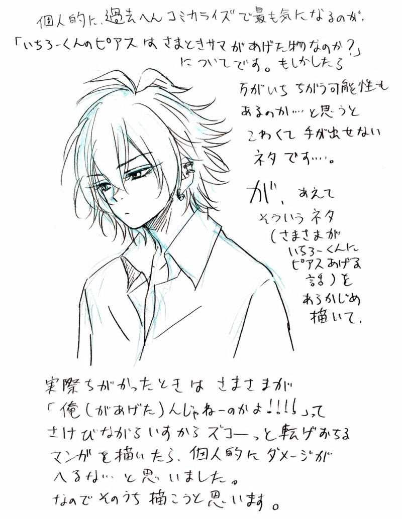 今月のエッジ、ひぷお休みなのを知らずに普通に買ってしまった…でも4コマショートが載ってたのでよかったです。以前友人に過去編コミカライズについて、もしいちろーくんのピアスがさまさまがあげたものじゃなかったらどうしよう…と言ったら「さすがにそれはなくない!?」と言われたんですが、その疑念が晴れないためなかなかピアスネタに手が出せません…受けるショックがでかすぎる。ので、それについての話。