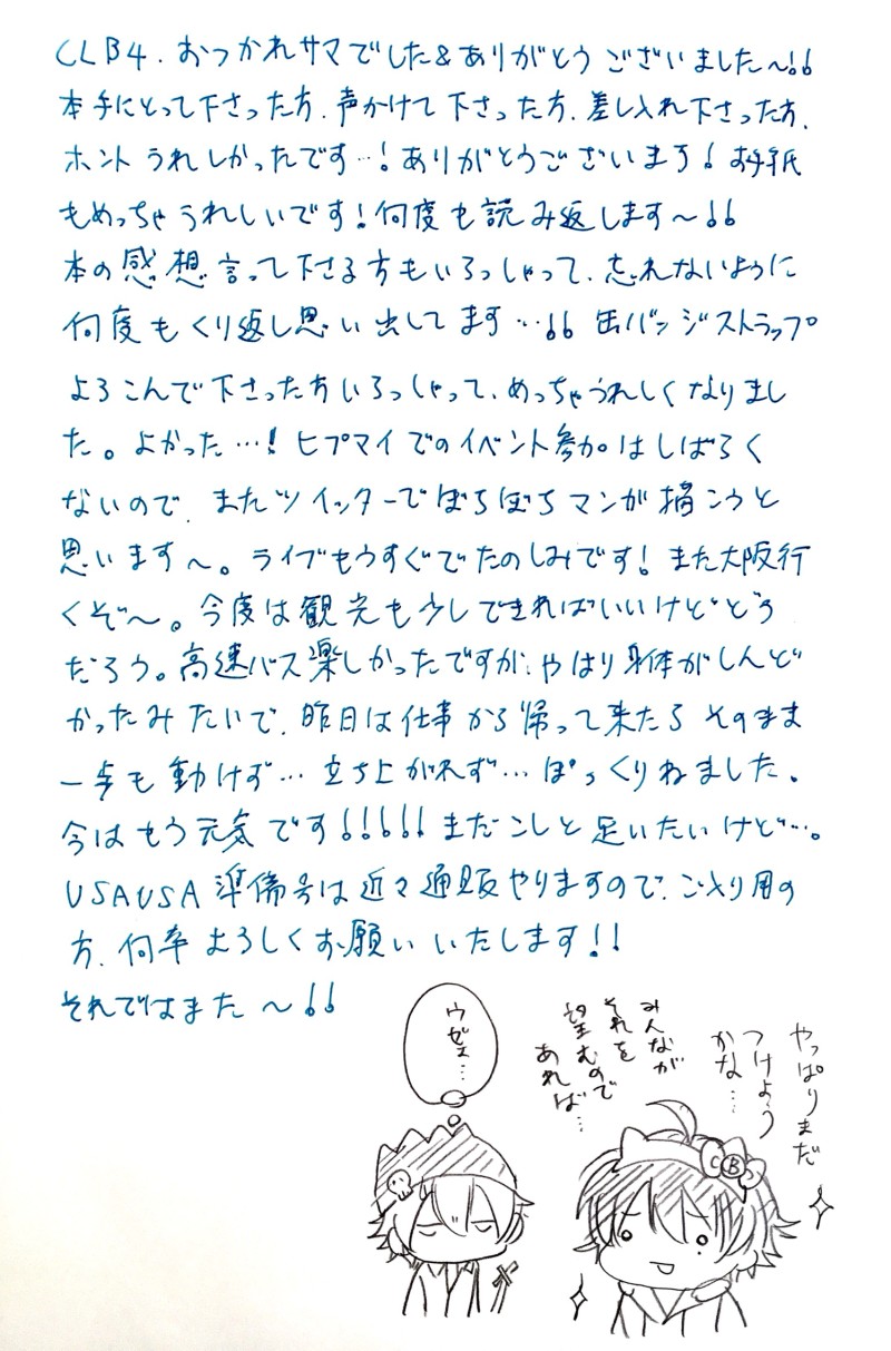 イベントお疲れ様でした〜!!怒涛の三ヶ月でした…楽しかった!!仕事が本格的に繁忙期に入るので10月申し込まなかったんですが、申し込めば良かったかな〜と少し後悔してます…。冬コミ受かるといいな〜!!落ちても2月のいちゅむちゅ出るつもりなので楽しみです!!ちびキャラになるといちくんがちょっと毒ある感じになっちゃうんですが、なんかこう…好きなんですよね…そういうの。毒のあるちびキャラが…。
