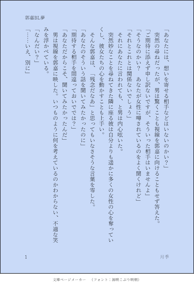 crescent_kabe28☆quiet followPAST郭嘉夢小説(男主ver) #さんむそ夢 dreamOfHavoc show all(+2 images) Tap to full screen (size:630x928).Repost is prohibited Let's send reactions! freqpopularsnackothersPayment processing Replies from the creator Follow creator you care about!☆quiet follow crescent_kabe28PAST郭嘉夢漫画「もしそうなら、私は幸せ者以外の何者でもない」最期を悟る郭嘉と。郭嘉描きやすい crescent_kabe28PAST馬岱夢漫画デジタルで漫画を書く練習をしたときの。急に終わる。うちの夢主は過去に訳ありすぎて淡白になった感じの子です。 3 crescent_kabe28PAST徐庶夢漫画 crescent_kabe28PAST郭嘉夢小説(男主ver) 3 crescent_kabe28PAST郭嘉夢小説(女主ver)死ネタ 3 related works crescent_kabe28PAST徐庶夢漫画 crescent_kabe28PAST郭嘉夢小説(男主ver) 3 crescent_kabe28PAST郭嘉夢小説(女主ver)死ネタ 3 crescent_kabe28PAST馬岱夢漫画デジタルで漫画を書く練習をしたときの。急に終わる。うちの夢主は過去に訳ありすぎて淡白になった感じの子です。 3