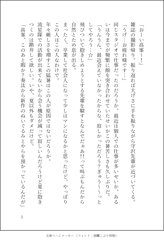 白米ポテト☆quiet followMOURNING途中です!!!!!前触れしか書けてない⚠流星隊死ネタ腐要素なしズ!!軸コメショ前ぐらいです、まだ全部スト読み終えてないしあんスタで小説書くの初めてなのでところどころ知識不足あるかもです🙇♀️これのプロットも当時の記憶もないためお蔵入りします、、 #流星隊 meteorTeam #守沢千秋 morisawaChiaki #死ネタ newsOfADeath #あんスタ Ensemble Stars show all(+1 images) Tap to full screen (size:630x928).Repost is prohibited Let's send reactions! freqpopularsnackothersPayment processing Replies from the creator Follow creator you care about!☆quiet follow 白米ポテトDOODLE南雲のちょっとえっちな(??)絵ですケモ耳としっぽが生えてるのでワンクします 白米ポテトSPUR ME1月中に完成するはずだったモブ鉄営業話です、導入までの尻叩きのため🔞シーンはありませんが予定として自慰行為の視姦、玩具(アナルパール、バイブ)の使用、腟内出しがあります、苦手な方は回れ右してください時期設定は!!軸MDM直後コメショ前です、今回のイベントネタバレはありません 1901 白米ポテトMOURNING途中です!!!!!前触れしか書けてない⚠流星隊死ネタ腐要素なしズ!!軸コメショ前ぐらいです、まだ全部スト読み終えてないしあんスタで小説書くの初めてなのでところどころ知識不足あるかもです🙇♀️これのプロットも当時の記憶もないためお蔵入りします、、 2 related works fuuumi_newMOURNING夏油傑×五条悟 死ネタです。9月の初め頃、宿儺戦で悟に負けるフラグが立ってきた時に保険で書いたやつです。だって!最強だから負けるわけない……確かにここで悟が勝ったら味気無さすぎるかもだけど、戦線離脱六眼が使えなくなるくらいで死にはせん…だって最強だよ?って思ってます。でもターミナルって生死の狭間表現有り得るので諦めてない。可能性はまだある……生きて。万が一の万が一の話でした。 2709 ずきんMAIKING※死ネタ花葬。 luluriumPASTなんかちょっとシリアスな感じの描きたい。みたいな時に描いた絵とグローバル版に占い師の背景推理が実装される前、一番最初に描いた占婚漫画(死ネタ)未来って同時にいくつもの可能性が枝分かれしていて、占い師は婚約者が一番幸せになる道を選んでしまうんだろうな、みたいに思いながら描いてた気がする。 7 tamaDOODLE食虫ジュニア食べログ1、佃煮編去年の夏に描いていたもの😂育成した虫セルjr.を調理して食べるサイコ飯という…もげてたりしている(微リョナ?)ので注意 5 ずきんDOODLE診断メーカーの結果がすごくコトハっぽいなと思って、コトハ(とタコボール)if死ネタで落書き+縦漫画っぽいの。最後のは、インクリングの血ってインクと同じ色なんだろか………とふと思って色を変えたもの。元ネタ死ぬ前に最も大切な人にコトハさんは何があっても大好きだよと言って泣きじゃくるshindanmaker.com/869130 4 tamaDOODLE食虫ジュニア食べログ2、串焼き編佃煮編に続いて第二弾。可哀想な目にあっているセノレjrを描く事そのものが性癖となっている節…最後にカオスなおまけつき^ 6 AyaTRAINING🥂視点解説すると、夢主は突然病に掛かってしまい、帰らぬ人になった🥂(※克服済)は"それ"を持ち、彼女に見せたかった夕日の海を"2人で"行き、🥂は涙を流しながら誓うといった設定です。(長文、失礼しました)△夢注意△死ネタ注意 水無瀬 瑞穂MAIKING普段書きかけの話を画像投稿なんてしないけれど、今回は特別にpotatoイベ終了後の類片想い話の冒頭部分。初っ端から司が死ぬけど、これくらいやらないと不眠症にはならないかな……って(鬼畜)大丈夫! こんな切り方だけどちゃんと夢オチだから! 次のシーンでちゃんと類が起きるから!夢オチだったらなにやってもいいと思ってるのは、まあ……うん(目逸らし) 3 tamaMEMOカニバ飯まとめ※飯ジュニ 4 recommended works りんごCAN’T MAKEMoMレポ描きたかったなってイラスト円盤楽しみです 2 nu.DOODLE⚡️ sawaraDOODLE山犬🐯 なみちDOODLEあんスタ/友也アニスタでソフトクリームあ~んされる友也かわいかったよねという絵 しろくじらDOODLEさむくて目がさめる時期になった nu.DONE🐝 まゆきDOODLE前の絵のシチュの続きですほんといきなり熱くなりましたねここ読んでくれはる方、お体ご自愛ください~ タキ(らくがき)DOODLE祈願にもならないらくがき とうのDOODLE童子と狐さん