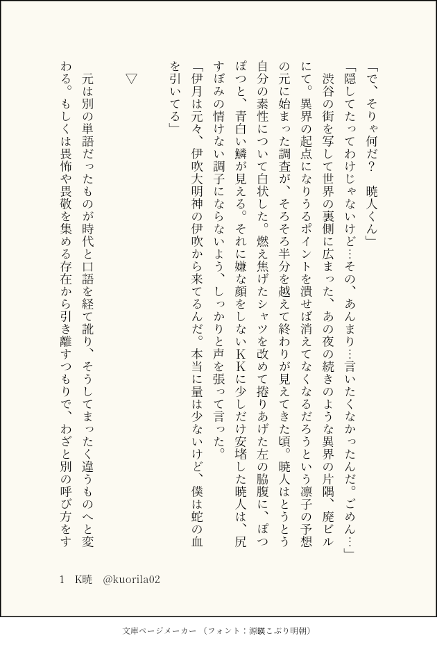 蒼ずみ☆quiet followPAST先祖お蛇暁人くん① K暁最後の会話はオマケ #K暁 show all(+10 images) Tap to full screen (size:630x928).Repost is prohibited Let's send reactions! freqpopularsnackothersPayment processing Replies from the creator Follow creator you care about!☆quiet follow 蒼ずみDONEリハビリけあきSSお酒よわよわAktくんとけけけのおじさんの回。そのうちお酒に耐性できるといいし、最後まで楽しく飲めるようになるといいね 2 蒼ずみDONE七夕のけあき諸々のアレソレで毎年必ず、年に一回だけ会える。 蒼ずみDONEK暁※当社比の生ぬるいすけべがあります※途中にモブ姦有り管狐の暁人くんとKKがなんやかんやしてイチャイチャする回。好き勝手に設定を生やしてます。最後の会話はオマケ。回収しきれてないあれそれについては、目を瞑って頂くかご想像にお任せします😌オマケ会話で「肌身離さず」を文字通り実行するK暁が出来たのでとても満足 19 蒼ずみDONEうろこをはぐ Webオンリーの展示物でした K暁ポイピク格納済みの過去SS「先祖お蛇暁人くん」を例祭用に練り直したものになります。文中には出てきてませんが、この暁人くんは邪視なんかも出来る設定。けけおじも承知した上で恋人やってます。誤字脱字や矛盾は見逃してください…!もしくはこっそり教えてくださいませ…!🙇♂️最後のはオマケという名の補足 11 蒼ずみPAST先祖お蛇暁人くん② K暁邪視して口裂の動き止める暁人くんが居ます 12 蒼ずみPAST先祖お蛇暁人くん① K暁最後の会話はオマケ 11 related works na2me84DOODLE140文字がたまったので纏めました。 21 鯖目ノスDONEゴスハンK暁小説エピローグ編です長々とお付き合いありがとうございました。これにて完結です。K暁といいつつもおじさんのクソデカ感情が露呈しただけですが将来的にK暁になる予定だからオッケー(?) 9522 時人歩DONEこのCPで書くのは初めてなので初投稿です。こんな処女作で大丈夫か。まだゲーム完走してないんですけど、これはここ逃がすと一年後になってしまうのでフライングで失礼します……!K暁です・3・ 2124 アカリMEMOアップしたK暁(🦊)の小ネタと🦊暁くんの絵です。 2 吉冬⛩DONE #毎月25日はK暁デーお題:彼岸花、徒競走けけおじの色んな面が好きなあきとくんの話。名有りのモブ依頼人が登場します。 7 085TRAINING #毎月25日はK暁デー より『ジューンブライド』 6 ウジムシ蛾DONEちょっと書いたのでのせてみます。K暁。 3704 32honeymoonMOURNING・マンネリ防止のために少しだけ変わり種。K暁。痩男が名前だけ登場します・二心同体軸ですがご都合主義でKKが体を得てます・ゲーム内時間で言うと5章の終わりくらいの時間軸・暁→K、K→暁の両片想い、とみせかけた完全両想い・最初やや無理強い表現はありますが基本的には愛し合ってます!最後中出し表現あります苦手な方はご無理なさらずそっ閉じで。PASS→20歳以上ですか?英語3文字でどうぞ。 7478 _hinon_CAN’T MAKEKKおじさんの匂いに酔っぱらう猫暁人くんのお話(猫パロ)K暁 337 recommended works mayuka_chanokaDOODLE謎らくがき 32honeymoonCAN’T MAKEたまには肉体アリif世界のけけあきちゃんたち。・Kも暁もお互いべた惚れです。あまあま砂糖吐きちゅうい。・常にKおじ視点です。台詞回しに違和感があったらごめんなさい。・特に本編のネタバレはありません。あまいちゃパラレルワールドの2人だと思っていただければ。・えちえちシーンはまた別途。というわけでとても短いです。えち期待してたひと、明日までお預けね。 1529 _hinon_TRAINING二心同体K暁えちちイラスト※R-18pw/🏍️のナンバー 鮫子_sharkyDONE除霊師KKと狐暁人8.25K暁日お题「初デート」!p1中国語p2日本語(翻訳機を使う) 2 リキュールDONE #2023年初めK暁ワンライ素敵な企画参加させていただきました!お題【おみくじ】いろいろ霊視で見えるようになっても、きっとわからないことはあるよなぁって思って書きました。 3198 吉冬⛩DONE #毎月25日はK暁デーお題:傘、真夏日、ネクタイゲリラ豪雨でびしょ濡れになったけあきが玄関でわちゃわちゃする話。 3 くろすけDONEゴスワイ、暁人のその後。暁→KCP要素ないですが、そのつもりで描いてます。左右なし。⚠️クリア後ネタバレ含む 4 nachi_osoraDONEねこめし(@5ilent_nya)様の素敵なネタに触発されて一本出来ました!情であきとくんの告白を受け入れたけど、すっかり骨抜きになって頭をかかえてるけけのお話です! 4057 碌ノ瀬PROGRESS.嵐の前の静けさのようなものを描きたくて…娘として大事にしながらも「一戦士」として尊重してるのが本当に大旦那に感服した所かもしれない。利刃襲撃時も(勝機が出る所まで調整してるとはいえ)場を任せてタルラの援軍に回るし、死を知った時には「本来なら稲穂を刈り取るように(ロドス陣営を)簡単に殺せたはず」というあたり印象に残っていてな…戦士としてもしっかり買ってたんだな…と思い印象に残っている…でも調整はするし護符も持たせちゃうんだよな…本当に情と公正の間でせめぎ合う人だよ…ああ〜並び立って来るのを相対する立場からでいいから1度見せてくれ…