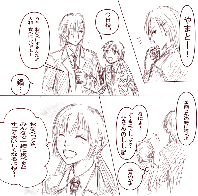 遙か7 やまなな未満落書き とにかく大和に天野家であったかいごはん食べてあったまって欲しい(※晩秋設定なので大和はジャケットです)