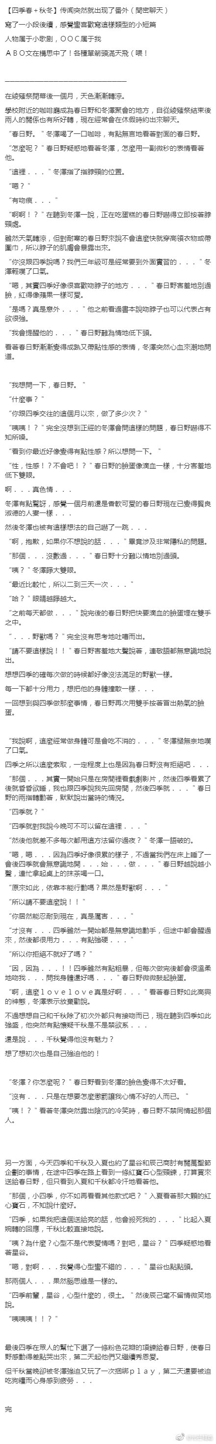 夏日之遙☆quiet followDOODLE高校星歌剧【四季春+秋冬】传闻突然就出现了番外(閏密聊天)寫了一小段後續,感覺蠻喜歡寫這樣類型的小短篇人物属于小歌剧,OOC属于我 Tap to full screen (size:440x2933).Repost is prohibited Let's send reactions! freqpopularsnackothersPayment processing Replies from the creator Follow creator you care about!☆quiet follow 夏日之遙DOODLE【四季春+秋冬】传闻突然就出现了(中下)A班仍然神助攻!然后四季真的成天然渣了(喂!人物属于小歌剧,OOC属于我下章可能有车可能没有(喂! 夏日之遙DOODLE【小歌剧ABO系列文】第五章 意识(四季春篇)第五章肝出来了!(吐血...又到四季春篇了!但今章前半部分是有关抑制剂的科普,写完这章后四季和春日野终于开始迎来转折点了!!然后箭头好像也少了...(笑哭)角色属于小歌剧,OOC属于我 夏日之遙DOODLE【小歌剧ABO系列文】空閑X虎石(愁和)番外 (虎石篇)这是ABO系列文中的番外小故事,因为在正篇空闲和虎石不是主CP所以写了番外的短篇文文,分虎石篇(虎石视角)及空闲篇(空闲视角,有车)和事后的小短篇。这次番外是洒了辣椒粉的甜饼,请注意食用(被打)番外故事部分内容也会在正篇有所提及的,但不详细。 夏日之遙DOODLE【抹布x刀及抹布x茸/啊23】猜谜游戏暗黑本丸俱乐部新游戏,今次刀剑和JOJO联合文!自从进入刀坑就爱上了茸茸,那就一起日吧!(被打 夏日之遙DOODLE入侵者?,啊23俱乐部审系列主X双性化一期,主X堀川(两名审神者)从一开始不写车变成写车打架再写车的一万五千写文(捂脸) 补档,很久以前的刀男文了,因为微博啊wland等被封所以…唉…我也一直很懒散(捂脸,把文补回来!密码:123456 2 夏日之遙DOODLE赛马竞赛--晚上場,R23暗黑本丸俱乐部,抹布X膝丸+岩融+静形+巴形+蜂须贺+明石补档,很久以前的刀男文了,因为微博啊wland等被封所以…唉…我也一直很懒散(捂脸,把文补回来!密码:123456 recommended works なーピーマヨネーズPASTジョジョ5部のジョルノ様描いたのは2年前くらいです seriDOODLE同じような落書きばかりする maruDONE seriDOODLEミスタ 練習 seriDOODLEレクイエムさん描きたいんです右隣に… ☆彡※△MAIKING完成するのか分からない謎シュチュ ちゅんたTRAINING domdoo00mePROGRESSグッズ用のちび暗チ途中〜あとペシとイルとソルジェラ描いてチビスタンドたちやらなんやら描いたり配置したり ちゅんたBLANK診断メーカーのやつそのうちちゃんとぬれたらなあ