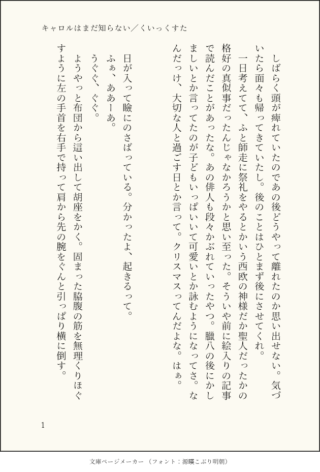 くいっくすた☆quiet followMOURNINGすこしふしぎ門キラ✳️🦌キャロルはまだ知らないちょっとだけクリスマス。いつかの未来に背中を押され暴走する✳️さんの話。どっちも押し流されるちょろおじたち…すき… show all(+7 images) Tap to full screen (size:630x928).Repost is prohibited Let's send reactions! freqpopularsnackothersPayment processing Replies from the creator Follow creator you care about!☆quiet follow くいっくすたDONE法務部✳️と工務部🦌のとこにいる✳️推しモブ子による観察記録。先日上げたバレンタインの話(問答無用の大遅刻)の日のモブ子視点。以前からたまにモブ子を書いていたので、ちょっとじっくり✳️🦌というか✳️部長の纏う「ニオイ」を探ってもらいました。途中途中の細かいとこの補完はできれば前の話を読んで欲しい…っ!🦌は影くらいしか出てこないです…。 4446 くいっくすたDONEもうすぐホワイトデー🍬ですね。ということでバレンタインの話です。なんか…時差が一ヶ月くらいあるみたいでぇ…。法務部門さん工務部きらぴの話を増やしました。この門キラは職場で致してばかりいる…。R-18部分はぬるいです。ただフェティッシュ寄りというか門さんがやや無体をはたらくのでご注意ください。PW:門キラ4ケタ 18728 くいっくすたDONEきょうはなんの日?【耳の日】ついったに不定期で載せてるきょうはなんの日シリーズ。ほとんどが140字なんですが、少しだけ長めのSSで。例によって3月3日の当日には全然間に合わずの大遅刻。竹で作るバージョンが百年以上前の科学本に載ってたそうです。北の大地に竹は自生しないので謎ルートで入手した謎の高級品仕上げに…。 4504 くいっくすたDONE首都圏に降る雪で大変な目に遭った門さんの話。さしもの雪国生まれも長いこと降る環境から離れて暮らすうちにカンが鈍っちゃうみたいです。 6847 くいっくすたDONEキラウㇱ生誕祭2024お誕生日おめでとう🎂✨aknk後の誕生日という設定ですが謎時空と思ってください。ブロマンス未満な感じ。absrのことを知ろうとするキラウㇱの話です。 5385 くいっくすたDONEクリスマス前から6日間の現パロ門キラです。ハロウィンに続き引くほど遅刻して載せます。イベント事のまとまったお話がほんとに間に合わせられません…。※年齢操作しています。自分の思う原作軸門キラより10歳くらい若いイメージです。門さん40手前くらい、きらし20代後半~30手前くらい。※オチウもヌンヌンもないよ!ちょっとだけもにょもにょはあるかも! 20524 recommended works makikanzakiDOODLE※背後注意(致してる風)クを泣かせたい袖あるなしじゃ違うな~ 2 PALE_1905DOODLE狐狸感滿滿的新繪型,感覺好適合被爆炒(第一次畫車圖,技藝生疏,不香的話請多多包涵qwq 18?( Yes/No) 8 ridiculedDOODLE急に描きたくなった年齢操作&夫婦な勇者✖️末娘 R18男性向けぽいらくがき注意です⚠️パスワードは 男と女はパ〇〇〇〇一体誰が見たいのか…とは思ってる💧のに追加しちゃった 引越し先が微妙に使いこなせなくて悲しみ 11 jugoyen15PASTカマソッソがぐだ子に無体を働く画、密マリ再掲。みんなもえっちなやつ描いてください(涙)サクカ差分ではお茶は濁りません。 2 ceyu9999DOODLE一晚内🐍几次【代号鸢策瑜】 黎恩kiameiDONE小姐之间的恋情如有ooc请见谅!谢谢支持! 9 やる気出せDOODLEエゴ🦁への劣情らくがき。(モブ🦁)⚠️ちょいすけべ。 fumiMAIKING まめおすDONEGO!押しかけ闇金ちゃん