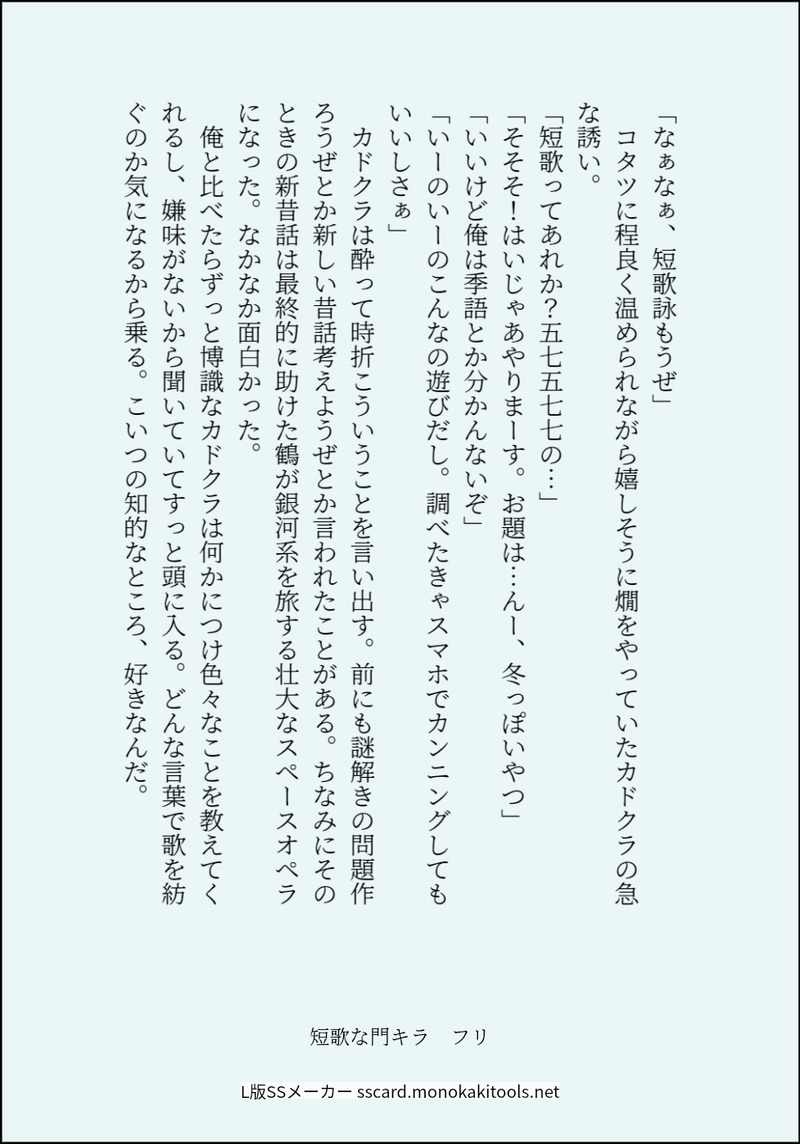 くいっくすた☆quiet followMOURNING短歌な門キラ✳️🦌シリーズ1枚目から4枚目はSS→✳️作短歌→SS→🦌作短歌と続いてます。5、6枚目学パロ。7、8枚目微エロ。今後も増えるかも。 #門キラ show all(+7 images) Tap to full screen (size:954x1365).Repost is prohibited Let's send reactions! freqpopularsnackothersPayment processing Replies from the creator Follow creator you care about!☆quiet follow くいっくすたDONE法務部✳️と工務部🦌のとこにいる✳️推しモブ子による観察記録。先日上げたバレンタインの話(問答無用の大遅刻)の日のモブ子視点。以前からたまにモブ子を書いていたので、ちょっとじっくり✳️🦌というか✳️部長の纏う「ニオイ」を探ってもらいました。途中途中の細かいとこの補完はできれば前の話を読んで欲しい…っ!🦌は影くらいしか出てこないです…。 4446 くいっくすたDONEもうすぐホワイトデー🍬ですね。ということでバレンタインの話です。なんか…時差が一ヶ月くらいあるみたいでぇ…。法務部門さん工務部きらぴの話を増やしました。この門キラは職場で致してばかりいる…。R-18部分はぬるいです。ただフェティッシュ寄りというか門さんがやや無体をはたらくのでご注意ください。PW:門キラ4ケタ 18728 くいっくすたDONEきょうはなんの日?【耳の日】ついったに不定期で載せてるきょうはなんの日シリーズ。ほとんどが140字なんですが、少しだけ長めのSSで。例によって3月3日の当日には全然間に合わずの大遅刻。竹で作るバージョンが百年以上前の科学本に載ってたそうです。北の大地に竹は自生しないので謎ルートで入手した謎の高級品仕上げに…。 4504 くいっくすたDONE首都圏に降る雪で大変な目に遭った門さんの話。さしもの雪国生まれも長いこと降る環境から離れて暮らすうちにカンが鈍っちゃうみたいです。 6847 くいっくすたDONEキラウㇱ生誕祭2024お誕生日おめでとう🎂✨aknk後の誕生日という設定ですが謎時空と思ってください。ブロマンス未満な感じ。absrのことを知ろうとするキラウㇱの話です。 5385 くいっくすたDONEクリスマス前から6日間の現パロ門キラです。ハロウィンに続き引くほど遅刻して載せます。イベント事のまとまったお話がほんとに間に合わせられません…。※年齢操作しています。自分の思う原作軸門キラより10歳くらい若いイメージです。門さん40手前くらい、きらし20代後半~30手前くらい。※オチウもヌンヌンもないよ!ちょっとだけもにょもにょはあるかも! 20524 related works 上课睡觉人DOODLE你别再画这种东西了 6 くいっくすたDOODLE今さらながら5月、6月についったに載せた140字や短いものをまとめました。あんまりなかった…。3月、4月の方にも間違って入ってるのがひとつあります。東の祭の話はインテが羨ましくて書いたちょっとお気に入り。ちょうど今も祭の後ですし! 19 かしおりDONE9/24tnkn3にて無料配布した門キラ本生臭坊✳️主×未亡🦌人パロです!(1ページめの注意書きをご覧くださいませ)お手に取ってくださりありがとうございました〜🥺! 9 シオ原DOODLE色差分も気に入ってるから見て とみいMOURNING 2 mochifuREHABILI現パロ。道内在住、喫茶店店主のキラウシ(37)と居候のカドクラ(49)が、ふたりで赤ん坊の面倒をみる話です。(※門キラです。付き合ってます)北海道の地理がわかりません。方言も雰囲気です。(本文には出てきませんがキラウシくんの父親は他界しており、喫茶店は元は父親の店です) 33 _uchida13DONE門キラ原作軸 4 書(格納庫)SPOILERようやく本誌に追いついた記念の絵(最新話というわけでもないですが) 2 _uchida13DONEキャバクラにいるキラウㇱと一緒にいる門の独白(現パロ) 1029