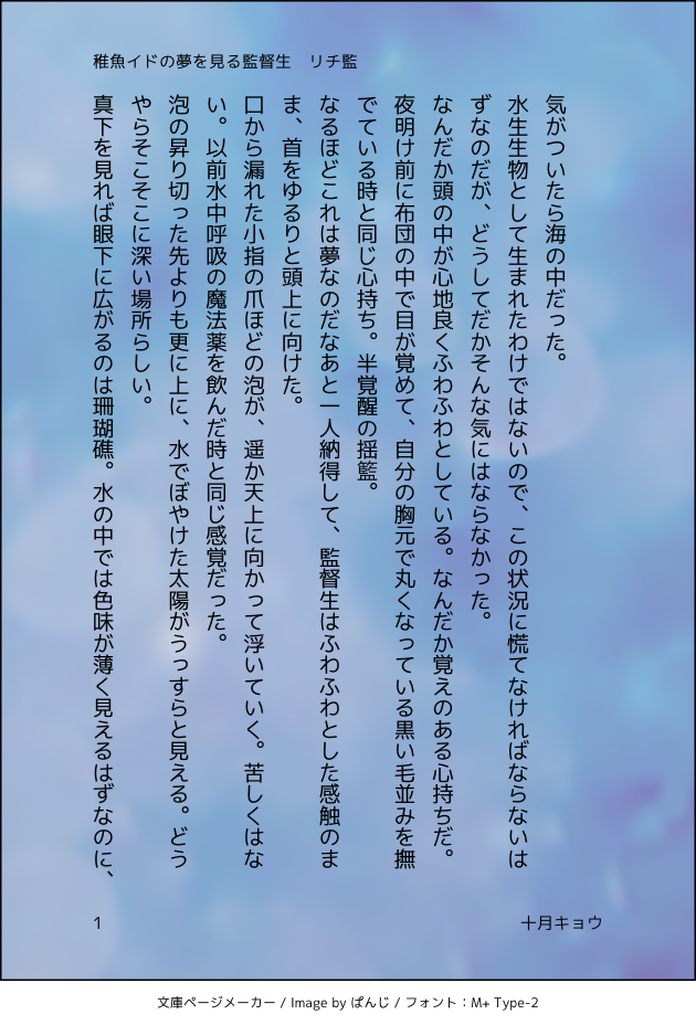 11kyo_25☆quiet followTRAINING800字チャレンジ(1485字オーバー)こんな感じのリチ監小説をかけたらなあという構想も兼ねて。夢の中で監督生が稚魚の頃のリーチ兄弟と会う話。リーチ兄弟ほとんど出てこないけど。 #twstプラス #リチ監 #ジェイ監 #フロ監 show all(+3 images) Tap to full screen (size:630x928).Repost is prohibited Let's send reactions! freqpopularsnackothersPayment processing Replies from the creator Follow creator you care about!☆quiet follow 11kyo_25REHABILItwst夢。イデ監♀SS。オンボロ寮に来て下さいと招待されたイデアがテンパるだけの話。800字チャレンジ用。ラブコメ。 2 11kyo_25REHABILI昔書いた狗神マンドリカルド×女子高生ぐだ♀の設定で。ぐだ♀が中学生時代の話。短い。ぐだ♀視点だとこう見えてるみたいな話。リハビリに書いた800字ショート。 2 11kyo_25REHABILI「護衛の仕事だけはしくじった事が無い」FGO以蔵さん過去話。Wikiで得た知識でしか書いてないので雑なのは許して。勝先生の護衛をやってる以蔵さんの戦闘描写書きたいだけで書きました。800字チャレンジ用。色々雑。 3 11kyo_25REHABILI以前書いたアイドルパロマンぐだ♀の続きというか、同じ世界線の話。800字チャレンジ用。フォロワーさんがお仕事大変そうだったから応援用に書きました。仕事が忙しくて眠れないマンドリカルドとそれに気づくぐだ子のお話。 3 11kyo_25REHABILIジェイドがほとんど出てこないジェイ監。フロイドと監督生が喋っているだけ。若干バイオレンス表現あり。やべー人魚が彼なりに頑張っているSS。800字チャレンジ。リハビリ作品。 2 11kyo_25REHABILIFGOのSS。「シェヘラザードのただひとりの戦友」カルデアのシェヘラザードとナーサリーライムの初めましてと再会の話。 3 related works 2watoyoDOODLE【朝のボールペン落書き】【日楠♀】【先天性女体化】日高先輩×男装後輩サキュバス家系楠ちゃん。海編。本当に気にしてるのは。 nnnnnnoodderaDONE【腐向け】チャバが酔ってハ崎さんに甘えてる漫画。ハ崎さんがトイレに行くのを我慢していたりする。 4 きくちゃんDOODLEサタン様犬好きかと思いきやロクサーンみたいなパターンもあるのでやっぱ人外思考なのかな~ ココノカSPOILER幻覚なので全くネタバレではないけど1072話の発言ネタ ちゃづDONE描いたやつその1※茨あん、ジュンあん 17 べこDOODLEピンク色のバレンタインなヨウグズ🍫 ちゃづDONE描いたやつその1※茨あん、ジュンあん 17 わたさくDOODLE きくちゃんDOODLEサタン様犬好きかと思いきやロクサーンみたいなパターンもあるのでやっぱ人外思考なのかな~ recommended works sakiL_3rdDOODLE紫式部無事召喚できたので記念ラクガキ。女の子全然描けません;; ラッチャーDOODLE たみゅこDONE紫式部のこと式部って呼ぶと俺の女感が出て好き カリンパ㊷DOODLEペペ *mirin*DONEアスクレピオスとナイチンゲール 2 wkR_wMOURNINGラフから加工までの無駄に増えてしまったゴジャPたち…😭(昨年のものと最近加工したもの…😭😭😭) 5 さいがゆのDOODLEパソコンが壊れました 5 海老フリッタDOODLE三白眼ってものっそい好み👏👏👏 まちゃオリジナルPROGRESSベース着彩中。まだまだガンガン着彩は続く。