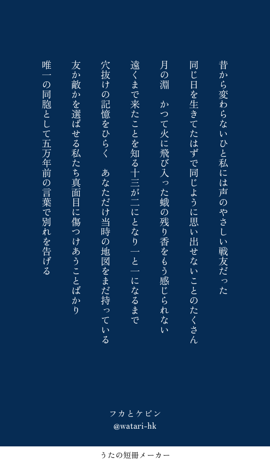 多々野☆quiet followDOODLE短歌/フカとケビン ##詩・短歌 Tap to full screen (size:550x950).Repost is prohibited Let's send reactions! freqpopularsnackothersPayment processing Replies from the creator Follow creator you care about!☆quiet follow 多々野MEMO『いまは遠いひかりに』の頒布時に使用した絵です本は先日頒布終了しました。お手にとっていただいたかたありがとうございました! 2 多々野MEMO崩BW4ありがとうございました! 3 多々野DONE短歌/1.セナ夢2.ブローニャ・ザイチク崩BW4のエアスケブで書かせていただいた短歌です。リクエストありがとうございました! 2 多々野INFOケビスウ短歌集を頒布します歌集『五万年ほどけない』B6/本文96P/¥1000(+Booth送料)9/13~9/15【崩壊シリーズWebオンリー】Beautiful World 4にて頒布予定■内容ケビン、スウを中心とした短歌を134首収録(うち新作は106首)他の英傑視点の歌も少しあります今までにアップした短歌のうちケビンとスウ関係のものはほぼ入ってます*素敵な表紙デザインは瀬波 朔 様(@saku_senami)にお願いしました!感謝です! 6 多々野CAN’T MAKEほどけなさそうな絵を描きたいが構図もポーズも思いつかない図 多々野DOODLE短歌/カスライナ