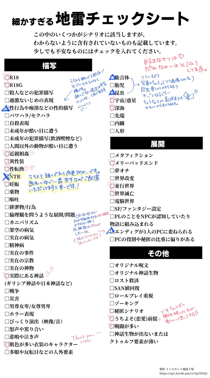 じじたろ☆quiet followINFOジジの地雷チェックシートです。全2ページあります。地獄工房様からお借りしております!https://booth.pm/ja/items/3432975 show all(+1 images) Tap to full screen (size:1138x2048).Repost is prohibited Let's send reactions! freqpopularsnackothersPayment processing Replies from the creator Follow creator you care about!☆quiet follow じじたろINFOジジの地雷チェックシートです。全2ページあります。地獄工房様からお借りしております!https://booth.pm/ja/items/3432975 2 じじたろSPOILERポケモンZA ネタバレ注意(ゲーム画面スクショ集一部)これはカラスバに狂ってる人カラスバの一挙一動に連写しては暴れ回ってるパパラッチ状態と化してる 4 じじたろDOODLE遺香廻り❌現未みんなに見せてたイラスト集 17 じじたろDOODLEシリウスの篝火❌現未ある夏の日🎐 じじたろDOODLE遺香×現未 pass:yesででに時効なので じじたろDOODLE遺香廻り現未×pass:yesHO1の例のやつ recommended works huangtuwwwDOODLE中不中,中不中,中不中主塞恶俗梗(。。)18+ yes/no 4 yourlocaljesterDOODLE18↑? yes/no 世界周DOODLE 26 HuangdouDOODLE 3 卓picSPOILER墓穴に納まる ネタバレ、同卓⭕️1日目のRPで好きなとこ whokilledmoiDOODLE【注意】都市伝説解体センターの一話、体験版のネタバレを含みます。いけしゃあしゃあと宣うセンター長が好き…… 3 GrailDOODLECuntboy EpelPenis Epel18+?: y/n ぬこ🐱INFO 7389 米ドル持ってないDOODLEバフォメットさん