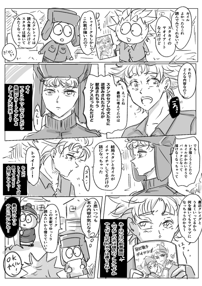 mochiricecome☆quiet followDONE腐男子トゥイークとカイルの漫画その②ついにスタカイ2次創作を始めたトゥイークがカイルに心の中で毒付かれる話です。続きます。 ##サウスパーク ##ヤオイパーク Tap to full screen (size:1414x2000).Repost is prohibited Let's send reactions! freqpopularsnackothersPayment processing Replies from the creator Follow creator you care about!☆quiet follow mochiricecomePAST別アカで描いてたクレトゥイ漫画再掲(まだあった)腐男子トゥイークが理解ある彼氏クレイグと一緒に即売会に一般参加する心温まるストーリーです☺️ mochiricecomePAST #好きなCPの攻に俺が浮気したらどうするって言わせて受けがどう返すかでCPに対しての理想が現れるていうタグがあったのでクレトゥイでやってみました〜。こちらも別アカに残してるクレトゥイ漫画ですがまとめておきます。あちらの方にスタンプ下さった方々ありがとうございました! mochiricecomePASTこちらもポイピク別アカに残してる漫画ですがこちらにまとめておきます。あちらの方にスタンプ下さった方々ありがとうございます!私にしか需要のないクレがヤンキー設定の学パロです。校内暴力とヤンキー同士の抗争が蔓延る学園で瞬きもせずワンナイトカーニバル(超適当)でも割と気に入ってる笑 2 mochiricecomePASTお知らせから飛べるポイピク別アカには残してあるクレトゥイ漫画ですが、こちらにもまとめておきます。あちらの方にスタンプ下さった方々ありがとうございます!クレイグがムショ帰り設定の大人クレトゥイif漫画です。元ネタはモロに最悪の俺にとびっきりの天使がやってくる某映画でした。 5 mochiricecomePAST別アカで描いてたクレトゥイ漫画再掲その④クレイグの顔ファン達がブッダボックスに対して抗議デモを起こす話。大事なのは顔じゃなくて中身だという大切なことをクレトゥイから学んだよね(適当) mochiricecomePAST別アカで描いてたクレトゥイ漫画再掲その③クレイグがブッダボックスキメてた頃の話です。クレイグの愛は結構重い。