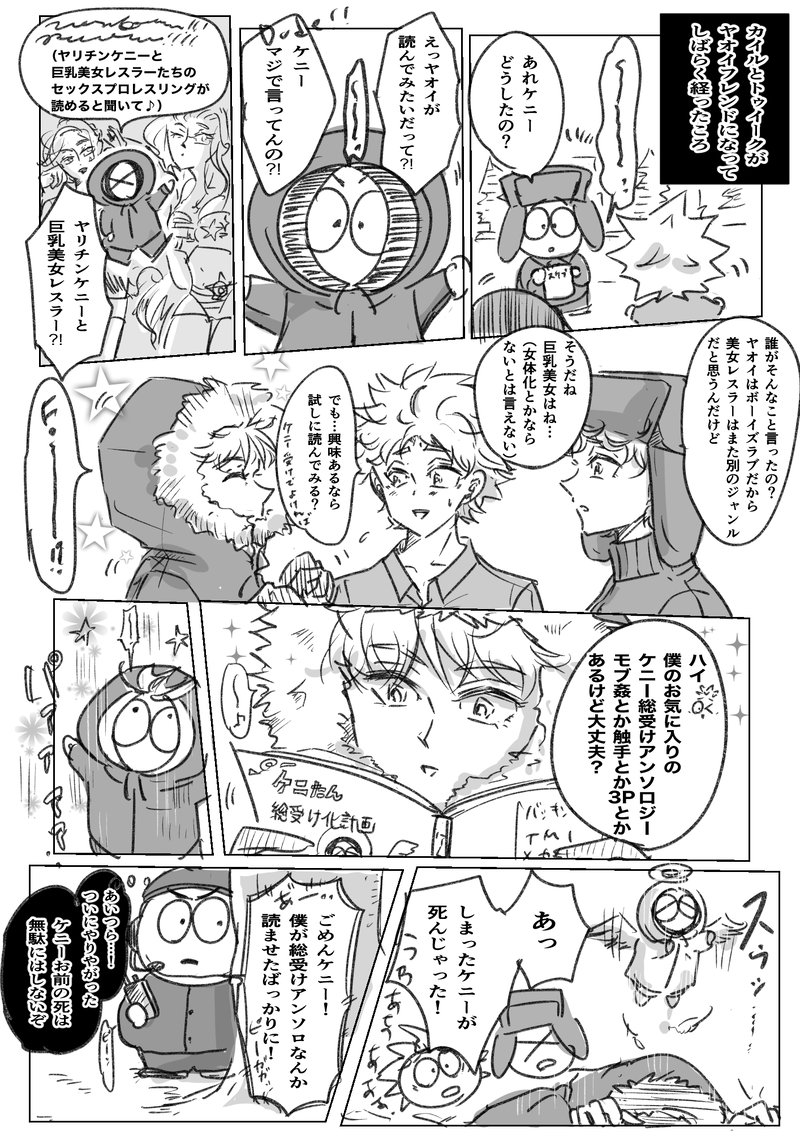 mochiricecome☆quiet followDONE腐男子トゥイークとカイルの漫画④ヤオイフレンドになったトゥイークとカイルが何も知らないケニーに総受けアンソロを読ませてしまう話です。ヤオイ布教は慎重に…!あと4ページくらいで終わります…? ##サウスパーク ##ヤオイパーク Tap to full screen (size:1414x2000).Repost is prohibited Let's send reactions! freqpopularsnackothersPayment processing Replies from the creator Follow creator you care about!☆quiet follow mochiricecomePAST別アカで描いてたクレトゥイ漫画再掲(まだあった)腐男子トゥイークが理解ある彼氏クレイグと一緒に即売会に一般参加する心温まるストーリーです☺️ mochiricecomePAST #好きなCPの攻に俺が浮気したらどうするって言わせて受けがどう返すかでCPに対しての理想が現れるていうタグがあったのでクレトゥイでやってみました〜。こちらも別アカに残してるクレトゥイ漫画ですがまとめておきます。あちらの方にスタンプ下さった方々ありがとうございました! mochiricecomePASTこちらもポイピク別アカに残してる漫画ですがこちらにまとめておきます。あちらの方にスタンプ下さった方々ありがとうございます!私にしか需要のないクレがヤンキー設定の学パロです。校内暴力とヤンキー同士の抗争が蔓延る学園で瞬きもせずワンナイトカーニバル(超適当)でも割と気に入ってる笑 2 mochiricecomePASTお知らせから飛べるポイピク別アカには残してあるクレトゥイ漫画ですが、こちらにもまとめておきます。あちらの方にスタンプ下さった方々ありがとうございます!クレイグがムショ帰り設定の大人クレトゥイif漫画です。元ネタはモロに最悪の俺にとびっきりの天使がやってくる某映画でした。 5 mochiricecomePAST別アカで描いてたクレトゥイ漫画再掲その④クレイグの顔ファン達がブッダボックスに対して抗議デモを起こす話。大事なのは顔じゃなくて中身だという大切なことをクレトゥイから学んだよね(適当) mochiricecomePAST別アカで描いてたクレトゥイ漫画再掲その③クレイグがブッダボックスキメてた頃の話です。クレイグの愛は結構重い。 recommended works naru968DOODLEとても落書き#サウスパーク 3 ゆきとTRAININGジャケットないとケニーに見えない悲しみ SooooogaDOODLE #サウスパーク エヌ.DOODLEファイアアルパカでカイル君落書き。メディバンといい無料なのにクオリティ高いやつ多くない? コロ助MOURNINGオールキャラの漫画初期のマフィンちゃんが大好きです。なのでまた誰かにやり込められたりして欲しいなぁ 8 とんこREHABILIスタンとカイル yoshio1350DOODLEケニー! お肉さん太郎DOODLE数日手の震えがやばくてトゥイークみたいでした。だいぶ治りました。良かった。 nk.DOODLEヒーローたち