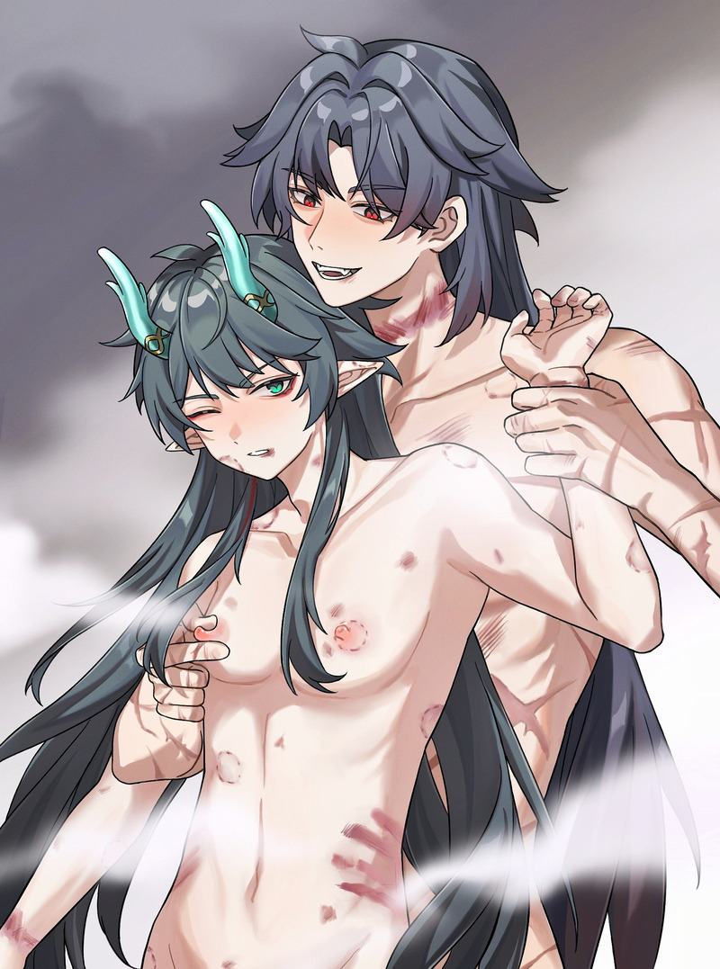 他想起梦中人金红色的眼瞳。那人狭长的眼睛仿佛色泽极好的红玉,又被巧手的匠人雕琢了十成十,纵然是对玉石痴迷且挑剔的罗浮人也挑不出一丝一毫的错处来。只是这玉石早已被杀意刻出一道又一道的痕,浸润着千百次的血腥气,遥遥一瞥送来,激越的金石刀戈之声在五感敏锐的哨兵耳边炸开。丹恒听到击云痛苦的嗡鸣声,锋利的边缘擦过长剑,带走干涸的血迹和一段痛苦的生息。精神链接断开带来的痛苦似乎再次在脑海中开幕重演,他破碎的精神图景里掀起一场小型的风暴,唯有那棵枯死的古木屹立不倒,那是他永久铭刻于心的罪证,一念差错酿下的苦果,他永远的镣铐和枷锁。