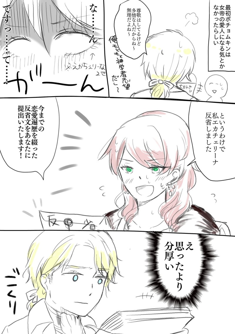 つくばい☆quiet followREHABILIエカチェリーナ2世とポチョムキンの往復書簡本より!真面目なポチョムキンが「(多情な)女帝の愛人になりたくない」と考えていたらしく、お召しを断っていたのにエカチェリーナが下手な恋愛小説より凄まじい恋愛遍歴を書き連ねた反省文を書き送っているのが抱腹絶倒だった #帝政ロシア #18世紀 #歴史創作 Tap to full screen (size:1443x2047).Repost is prohibited Let's send reactions! freqpopularsnackothersPayment processing Replies from the creator Follow creator you care about!☆quiet follow つくばいREHABILIエカチェリーナ2世とポチョムキンの往復書簡本で面白かったの、なんかすごい人が「ちわーっす!ファルケンシュタインでーす」ってお忍びに来てポチョムキンがロシアのとある街を案内しなきゃいけなくなった話※グリーシャ=ポチョムキンの愛称らしい つくばいREHABILI伊達政宗が奇行する→細川忠興が奇行ネタを立花宗茂あたりから仕入れる→忠興が息子の細川忠利に仕入れたネタを手紙で披露するってパターンが多いので伊達政宗の奇行を知り尽くしている細川忠利の予感。政宗の息子の伊達忠宗と忠利は仲良しらしい。 つくばいREHABILIエカチェリーナ2世とポチョムキンの往復書簡本より!真面目なポチョムキンが「(多情な)女帝の愛人になりたくない」と考えていたらしく、お召しを断っていたのにエカチェリーナが下手な恋愛小説より凄まじい恋愛遍歴を書き連ねた反省文を書き送っているのが抱腹絶倒だった つくばいDOODLE【歴史創作】「精神的にアガる場所はどこですか?」と聞かれた足利さん親子義政「富子は嫁いで来た時からそうだから!新婚旅行は証券取引所とかいいだしたからね!」 つくばいDOODLE【歴史創作】嫁から借金してそうな足利義政 https://twitter.com/harukooo6v6/status/1269201359221350400?s=21 の続き! つくばいDOODLE【歴史創作】仲の悪い足利義政と足利義尚室町時代はどれだけ退廃的でも許される予感 related works nnnnnnoodderaDONE【腐向け】チャバが酔ってハ崎さんに甘えてる漫画。ハ崎さんがトイレに行くのを我慢していたりする。 4 2watoyoDOODLE【朝のボールペン落書き】【日楠♀】【先天性女体化】日高先輩×男装後輩サキュバス家系楠ちゃん。海編。本当に気にしてるのは。 ちゃづDONE描いたやつその1※茨あん、ジュンあん 17 べこDOODLEピンク色のバレンタインなヨウグズ🍫 きくちゃんDOODLEサタン様犬好きかと思いきやロクサーンみたいなパターンもあるのでやっぱ人外思考なのかな~ わたさくDOODLE ちゃづDONE描いたやつその1※茨あん、ジュンあん 17 きくちゃんDOODLEサタン様犬好きかと思いきやロクサーンみたいなパターンもあるのでやっぱ人外思考なのかな~ ココノカSPOILER幻覚なので全くネタバレではないけど1072話の発言ネタ recommended works きたのDOODLE大天狗の白昼夢 きたのDOODLEバレンタインデーすなわちおらんだ節分(造語) きたのDOODLE描かないとすぐ下手になる 2 ゆきふね壽左衛門PROGRESS本編1部〜ここ可愛くて好き よよよDOODLE勢い余って去年の絵を描き直しました 2 キミドリDONE 斗川とおいPAST杜陵隊の城戸治太郎くん。http://www.town.shiriuchi.hokkaido.jp/kyoiku/shakai/kyodo/shisetsu/nekozuka.htmlこの矢不来で討ち取った敵兵というのが城戸治太郎くんだそうです。化け猫… よ(いち)DOODLEおタバコ 2 奈倉まゆみDOODLE毒づく藤原道信。藤原実方と藤原実資、一文字違いだなあと思って。