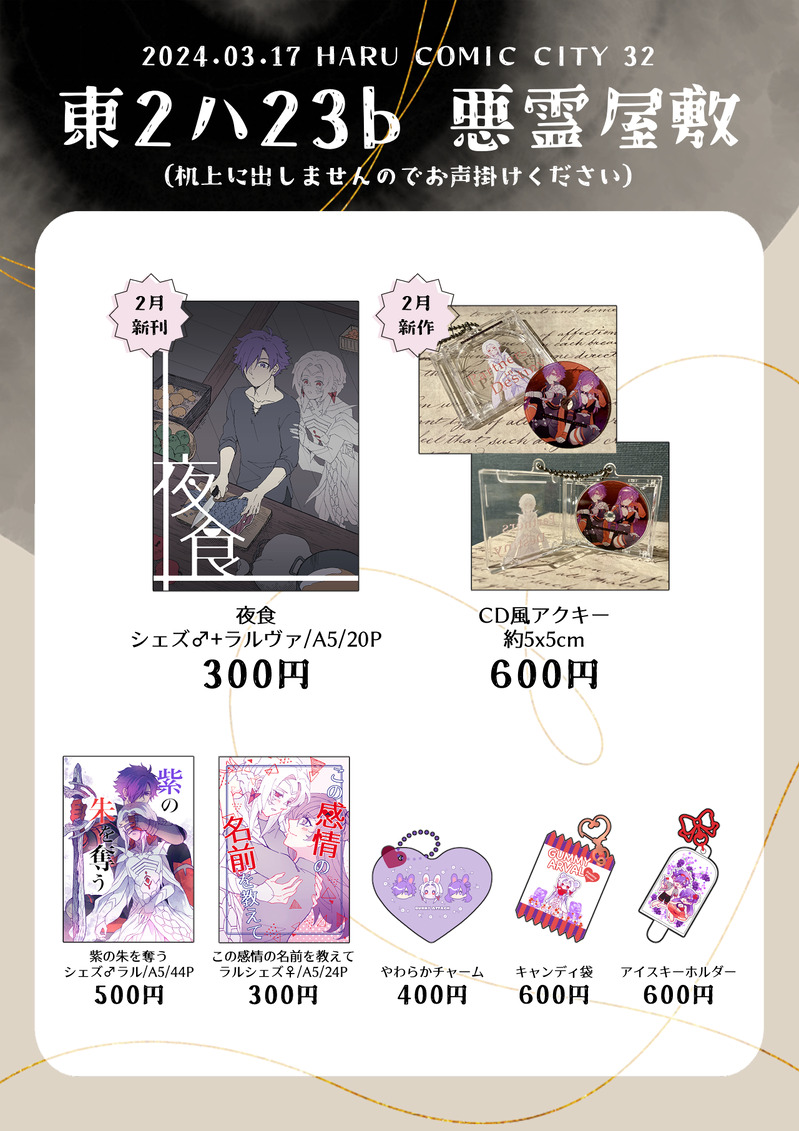 亡霊🐰☆quiet followMENU3/17春コミ東2ハ23b「悪霊屋敷」別ジャンルでの参加ですが、同日こくほこも開催ですので、無双風花の頒布物も少部数持ち込みます。お品書きは机上に置きますのでお気軽にお声掛けください。よろしくお願いします🙇♀️ Tap to full screen (size:1280x1811).Repost is prohibited Let's send reactions! freqpopularsnackothersPayment processing Replies from the creator Follow creator you care about!☆quiet follow 亡霊🐰INFO運命共同体の絵、とりあえずpixivにあげていた分をサイトにまとめた〜!https://ghosthouselog34.weebly.com/few3h.html近頃pixivのほうは非公開にします。(完売した本のサンプルは先に非公開にしました)今後は在庫がある頒布物のサンプルだけpixivに残ります。よろしくお願い致します🙇 亡霊🐰INFO【サークル参加します!!】01月12日(大阪)SUPER COMIC CITY 関西30内 超刻印の誇り 2025冬 シェズラルで申し込んだ〜新刊出せるか危ういけど(出したい) 亡霊🐰INFO9月のラルシェズ♀新刊、通販はじめました。よろしくお願い致します。また、今回からBOOSTはご遠慮頂きますようお願い致します。https://p5log.booth.pm/items/6203549そして個人サイトも作ってみました。別ジャンルも含めた雑多サイトだと思ってください。まだ何もないです〜https://ghosthouselog34.weebly.com 亡霊🐰DOODLE本日はお立ち寄り頂きありがとうございました!差し入れ絵はフライングハロウィン次の予定は1月のインテを検討してるけど新刊出せそうにないのですごい悩む新刊ですが、来週から旅行や帰省で留守の日が多くてしばらく通販対応できませんので通販は10月下旬の予定になります 亡霊🐰INFO今日はよろしくお願いします!新刊の装丁めちゃくちゃ良い! 3 亡霊🐰DOODLE出せたらいいなの現パロシェズラル明日イベントよろしくお願いします!この前ポイピクにバグあった?みたいだけど今はもう大丈夫かなここが動かなくなったらたぶんXのほうにいるてかどこに行っても穏やかじゃないなSNSは recommended works 360maruiDONEメディア欄乱雑すぎて見にくくなってきたので過去のニキマヨ落書きこちらに再録します! 2 360maruiDOODLEワンドロ再録 お題:食育 お借りしました🙇♀️ 3 360maruiDOODLEワンドロ再録 お題:七夕 360maruiDOODLEキスパ夜の部現地レポ※中の人をニキマヨに代理でやってもらってます※ 360maruiDOODLEワンドロ再録 お題:ぬいぐるみ お借りしました全然ニキマヨぽくなくてすみません…私はこうやってぬい持ち運んでます。。 sorairoskyblueDONE2021年12月12日 Dozen Rose Fes. 宇煉プチオンリー『輝石の焔』にて発行しました無配です。クリスマスにまつわる①ホラー軸の宇煉ちゃん②DK軸の宇煉ちゃん③よもやま軸の宇煉ちゃん④四十路軸宇煉ちゃんです。アンソロ等の感想も含めて、送っていただけると元気でます。マロ→https://marshmallow-qa.com/sorairoskyblue? 15036 ^_^PAST■【2021/07/24発行 ジャンル混合夢漫画本 再録】※二枚目注意書き必読odskと名無し・顔あり夢主の漫画 odskは最初から死んでいます 12 💮toPAST22/01に発行したコピ本+無配のWEB再録となります。レオンさん視点で難産&ほぼ突発本なのでだいぶ駆け足気味な内容ですが、個人的にお気にな一冊です。お手に取って下さった方々、ありがとうございました! 25 ɴᴇɴᴇDONEホムラのお誕生日に描いたやつ有給取って3/6当日に間に合わせた思い出みんなにお祝いしてもらってよかったね…… 2