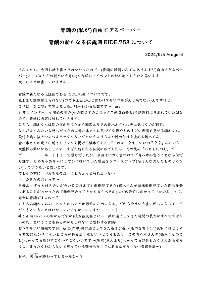 aragami4288☆quiet followPAST本日RIDE.758掲載巻発売日なので!全ケイGW2024で配布していたRIDE.758の作文(作品ではなく作文。青鏑)を公開しておきますね(そのうち消えますたぶん) show all(+1 images) Tap to full screen (size:2480x3508).Repost is prohibited Let's send reactions! freqpopularsnackothersPayment processing Replies from the creator Follow creator you care about!☆quiet follow aragami4288SPOILERじゃいあんとこーんのシークレット※今日からのやつ。だから本当にネタバレ。 aragami4288DONEメリークリスマス!兵長お誕生日おめでとうございます!じゆみちafterの店舗外観です。店舗外観に設定した際に中央に載る水晶玉をひらひらの飾りとしているため、そこの部分は空いています。 aragami4288MEMOリヴァエレの最中にまつわり呟きたかったことを、全然R18な内容じゃないんだけど微妙に伏せたいのでワンクッションにしました(作品ではなく特にオチもないただの呟き) 516 aragami4288SPOILER※本誌ネタ※6段ギアの色どんな色だろ~という自由研究です。白以外はカラーコード諸説ありそうだったので、淡黄檗以外は以下から引いてきました(淡黄檗はなかった…)https://www.colordic.org/wこのカラーコード使わなかったとしても、色を想像するとき、山吹より橙の方が濃いと思うんですよね…(だんだん濃くなるグラデーションってわけでもないんだな、という感想) aragami4288PAST本日RIDE.758掲載巻発売日なので!全ケイGW2024で配布していたRIDE.758の作文(作品ではなく作文。青鏑)を公開しておきますね(そのうち消えますたぶん) 2 aragami4288INFO「集え!わんこの民!わんわん☆わんだふるでー!〜わんこをかかげよ〜」の展示物です。2コマ目の幅を見て右側に1コマ目を配置しようとしていたので、なぜか2コマ目のしかも半分くらいですが、イベント中の展示はここで打ち止めとしたいと思います。。 recommended works ViktoriiaHolmsDOODLEscarakazu🔞⚠️kazussy, belly bulge, lactation⚠️ 4 🍚酒DOODLE20220611 Venazepassword hint: ma ______ 2 yuito_dream27DONE #夜の819プラス #夜のHQプラス オイカワ / クニミ / サクサ / コモリ【雨に降られて、下着が透けちゃった🌸にスイッチが入る🏐男子③】※♡喘ぎ、濁点表現あり未成年閲覧NG🙅♀成人済みですか?▶( yes / no ) 4 SefDONEgoldenloin challlllkDOODLE四回。女上好累还是年轻人体力好(?总的来说是作者本人压力释放产物(? 紫乃(しの)DOODLEニルヴァーナへはまだ遠く(https://www.pixiv.net/novel/show.php?id=23280247)シリーズを全部読んでいるという前提の話ですんで。最終話公開した後に各方面(?)から気付くのに3年もかかる!?(意訳)と言われたので一年に短縮してみました。突発お年賀がわり 4341 leichen6194MOURNING小龙亲亲 _moml_DOODLE 19 中璃。DONE正イデほよん立ち絵だよ