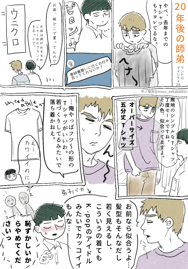 masu_oekaki8810☆quiet followDONE2023年2月19日(日曜日)ワンドロライシテイのラストお題「20年後の師弟」一応カプ無しですがだいぶ仲良しの、48歳の師匠と34歳の茂夫。れ「おまえはまだ34歳だもんな〜ピチピチじゃん」モ「師匠、30歳になったときに自分のことオッサンだオッサンだって言ってたのに」れ「たしかに…今思えば俺だってピチピチだったんだよな〜」モ「きっと僕が48歳の時も同じこと言いますよ」 #モブサイコ100 Mob Psycho 100 #霊幻新隆 Reigen Arataka #影山茂夫 Kageyama Shigeo #ワンドロライシテイ26 wandrolaiCity26 #アイビスペイントX ibisPaintX show all(+1 images) Tap to full screen (size:834x1194).Repost is prohibited Let's send reactions! freqpopularsnackothersPayment processing Replies from the creator Follow creator you care about!☆quiet follow masu_oekaki8810DOODLEネットプリントで頒布した、「忍たまどハマり日記」から3ページ。(2枚目は見開き)※ネタバレだらけです!リクエストあればまたネットプリントに上げます。https://wavebox.me/wave/2qxovnr88de56jtw/ 2 masu_oekaki8810DOODLE闇堕ち乱太郎を夢見てる。流血注意。成長if。 masu_oekaki8810DOODLEにんたま、というか落乱。いやーアニメもすごいけど原作すごい。そしてまたアニメ(全員出動)を観て「すごい」となり、また尼子騒兵衛作品集とか読んで……甘いしょっぱい甘いしょっぱいの永久機関みたいな。 9 masu_oekaki8810DOODLE最近のモブサらくがき。めっちゃ💖を連打してくれた方がいたので……ありがとうございます!😘3枚目は映画「Wicked」を観て、やたら自信過剰の居丈高だけど悪いやつではなく意外と世話焼きタイプで持論を早口で展開しがちで動きがめちゃくちゃうるさい、善き魔女グリンダってやつが出て来てめっちゃ良かったんですけど、ちょっと霊幻ぽいなと。 4 masu_oekaki8810DONEシテイシティ5のお題「まじめな顔しながらふざける師弟」のSSです。別に二人はふざけてるわけでもないからちょっと違うかも。あと「師弟」というか「弟」かも。 1463 masu_oekaki8810DONEシテイシティ5の展示漫画です。ネタ帳に溜め込んでた小ネタを1ページ漫画にした5本立てです。以前にTwitter(現X)でつぶやいた内容もあります。師弟がいろんなかんじで仲良しです。(ネタ被りあったらすいません〜😅)⚠️最後の1作だけモブ霊前提になってます!(実際にはなんもしませんがやや下ネタです。)⚠捏造霊幻姉が出てきます。 5 related works きりやDONEモブパズのキャラクターセレクト、今まで作ったやつまとめ。複数枚アップの練習もかねて。 7 豆雨 ユッ子DOODLE影山兄弟かわいいね teethDONEDecapitation reimob my beloved,, 2 鳳子(凤子)DOODLE*播放狮子王bgm 鳳子(凤子)DONE小雨中和ekubo一起散步 auk_pDONEアニメ7話が凄かった衝動+αどんなジャンルでも師弟や相棒はいいものですね 2 うー助DOODLEモブくん✏️ 鳳子(凤子)DOODLEchoker-茂夫 戌神/イヌガミ@すみのDOODLE授業中に、最近ハマったモブサイコ100のモブを描きました!!近日水彩画モブ描こうとしてます!!←え?ハマるの遅いって?まだ3年前だから!!3年前!セーフセーフ!!(コラボカフェないかな………)