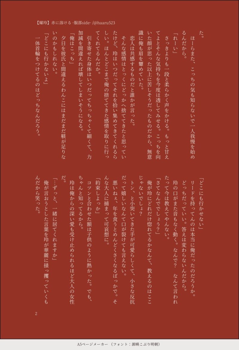 永@haaru523☆quiet followDONE【耀玲】「赤に溶ける -服部side-」"『嬉しい』は、おじいちゃんになったら言ってあげる。" show all(+2 images) Tap to full screen (size:888x1300).Repost is prohibited Let's send reactions! freqpopularsnackothersPayment processing Replies from the creator Follow creator you care about!☆quiet follow 永@haaru523DONE【耀玲】Aloha, My Girl /全4PALO=〜の前、御前にHA=神の贈り物、生命直訳で「神からの贈り物の、貴方の前にいます」の意味から来てるらしいです。(ネットの海より🏖) 4 永@haaru523DONE【耀玲】ワルツ第9番ワルツ第9番を知っていた耀さんと知らない玲ちゃんのお話。ワルツ第9番は『別れのワルツ』または『告別』。第15番はブラームスの方です。とても幸せになるので耀玲ちゃんを想いつつ是非。着想を得た素敵なお題は『月の真下に君の座標』と『一緒に踊りましょう』です。ありがとうございました🙂 4 永@haaru523DONE【耀玲】青い火がわたしを圧し潰すとき不純物がなくて、綺麗な酸素で青く燃えるんです…綺麗な玲ちゃんの…(遺言) 永@haaru523DONE【耀玲】誰が為の/両サイドAJの耀さんの腕がえっちだよ……… 2 永@haaru523DONE【耀玲】独り占めたぶん甘い耀玲ちゃん。服部耀さんの綺麗な瞼にアイシャドウを乗せたくなった私の性癖(⍢) 4 永@haaru523DONE【耀玲】青くて狡いSSRの耀さん祈願で書いたもの耀さんにアイシャドウを塗ってもらう玲ちゃんのお話糖度は低めです。 3