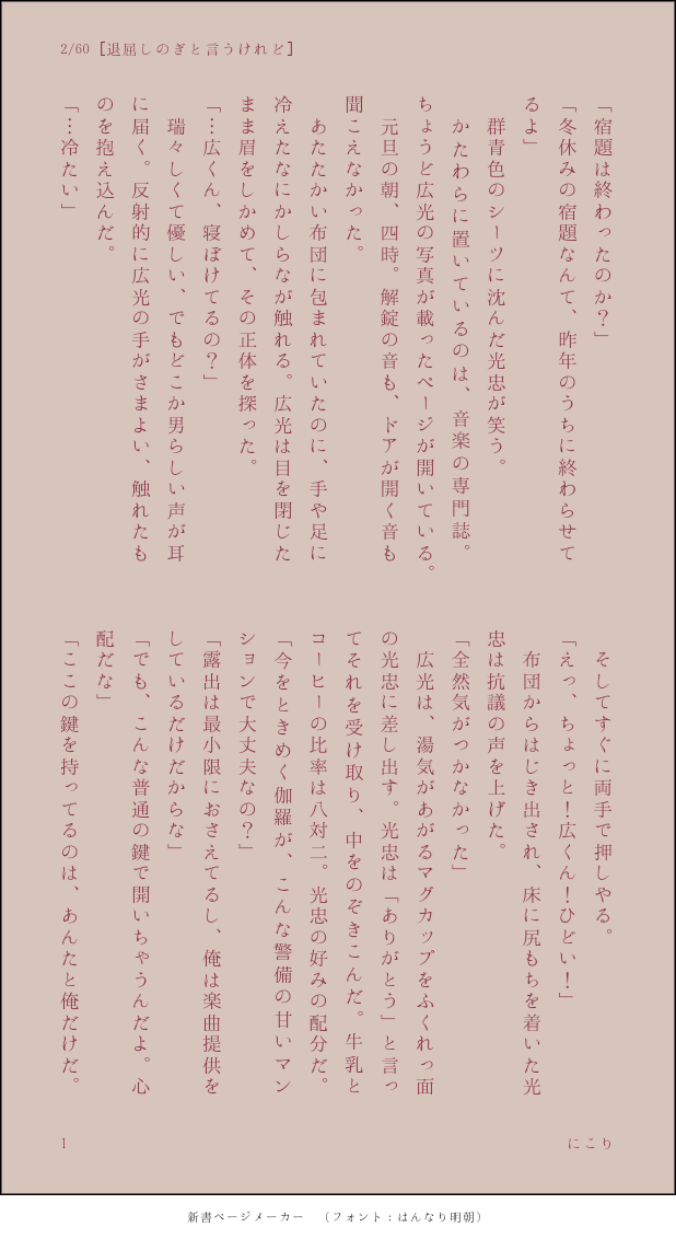 nicoliene_fanta☆quiet followTRAINING60本ノック2本目[退屈しのぎと言うけれど]お題元:しのぐ式様▷▶︎▷▶︎https://shinogu-shiki.com show all(+2 images) Tap to full screen (size:618x1132).Repost is prohibited Let's send reactions! freqpopularsnackothersPayment processing Replies from the creator Follow creator you care about!☆quiet follow nicoliene_fantaSPUR MEガチオタ光忠さんとアイドル伽羅ちゃんその3 1898 nicoliene_fantaSPUR ME本になるかもしれんやつ、つづき 3221 nicoliene_fantaSPUR ME本になるかもしれんやつ 2601 nicoliene_fantaSPOILERマダミス「何度だって青い月に火をともした」の一文字がやってみたです。冒頭部分のみ、ネタバレは配役のみですがポイピクにします。 2 nicoliene_fantaTRAINING60本ノック7本目〔このプリン食べますね〕お題元:しのぐ式様▷▶︎▷▶︎https://shinogu-shiki.com 3 nicoliene_fantaTRAINING #みつくりワンドロ・ワンライ創作60分真剣勝負テーマお題「告白」台詞お題「我慢できない」4頁 4 recommended works らいかDOODLE #燭台切光忠 #刀剣乱舞 そぜ。DONE友人に捧げた大倶利伽羅寒空の中迎えに来る待つ倶利伽羅#大倶利伽羅#とうらぶ#刀剣乱舞 2 らいかTRAINING #大倶利伽羅 困ったときは刀を持たせてみる あきらDOODLEみつくりの日おめでとう!ホワイトボードは友達 六籠@eL_MutukaGTRAINING大倶利伽羅、アイビスペイントでコピック塗り練習と、素塗り絵。 2 azutyaPROGRESSいつもなら、絵を描いてから4コマなのだが、今回は書く前に4コマ。#燭台切光忠 #大倶利伽羅 #刀剣乱舞 #とうらぶ azutyaDOODLE雑絵落書きLive配信、閲覧ありがとうございました(笑)(笑)(笑)いや、喋りながらってみんなどうしとんのん?( ̄▽ ̄;)#燭台切光忠 いちよーDOODLE 咲楽優/S.yuDOODLE今日の一枚▶大倶利伽羅