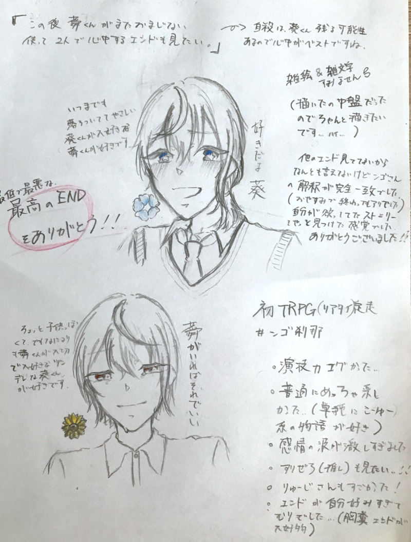 Sora13Maru☆quiet followDOODLEめっちゃ雑なんですがネタバレ含むと思ったので(ツイートの仕方がよく分からなかったので)こっちで!初めて使うのでできてる気はしません🫥🙃 show all(+2 images) Tap to full screen (size:2283x3015).Repost is prohibited Let's send reactions! freqpopularsnackothersPayment processing Replies from the creator Follow creator you care about!☆quiet follow Sora13MaruSPOILERただの女子高生が何となく作った曲の歌詞です。みろやグドモの創作活動です。⚠️歌詞はバリバリにネタバレを含みます⚠️おまけはネタバレはないですが加工してないです。 3 Sora13MaruPROGRESS #とろ〜りメシア のネタバレが多分あります。完成できる気がしなかったのでポイポイしに来ました。びっくりするぐらい途中。アナログです。リアルタイムで見ながら書いてたヤツです 2 Sora13MaruDONECoC【救世主】 #とろ~りメシア1、2日目のイラストですネタバレかも。ルーズリーフに描いた雑なアナログイラストです〜 2 Sora13MaruDOODLEめっちゃ雑なんですがネタバレ含むと思ったので(ツイートの仕方がよく分からなかったので)こっちで!初めて使うのでできてる気はしません🫥🙃 3 recommended works HRN🌈DOODLE⚠️ネタバレ#とろ〜りメシア途中絵!今日のロールが熱すぎて殴り書きしました教団去り際の3人のロール大好き りてあ𓆝DOODLE #とろ~りメシアもう最高だった…救世主ほんと好き…⚠ネタバレ注意⚠ラストページに感想あります!未通過✕ 4 ぬぅんDOODLE #とろ~りメシア 小学校の幼馴染感、リアルで好きだ〜〜〜!圧倒的に『光』でした…! 2 Sora13MaruDONECoC【救世主】 #とろ~りメシア1、2日目のイラストですネタバレかも。ルーズリーフに描いた雑なアナログイラストです〜 2 ありさわさんSPOILER #とろ〜りメシア⚠️配信内容ネタバレ注意⚠️※KP超高音さんの情景描写を基にした、捏造モブキャラがメインの捏造話です〜〜〜〜〜〜〜〜〜〜〜〜〜〜〜〜〜〜〜〜いつか、どこか、誰かの救世主(ヒーロー)〜〜〜〜〜〜〜〜〜〜〜〜〜〜〜〜〜〜〜〜 2 玲於1218SPOILER難しくてちゃんとかけなかったので供養 5 Sora13MaruPROGRESS #とろ〜りメシア のネタバレが多分あります。完成できる気がしなかったのでポイポイしに来ました。びっくりするぐらい途中。アナログです。リアルタイムで見ながら書いてたヤツです 2 onsen071000SPOILERとってもよかった…#みろやグドモ もちの猫DOODLE #みろやグドモ 2